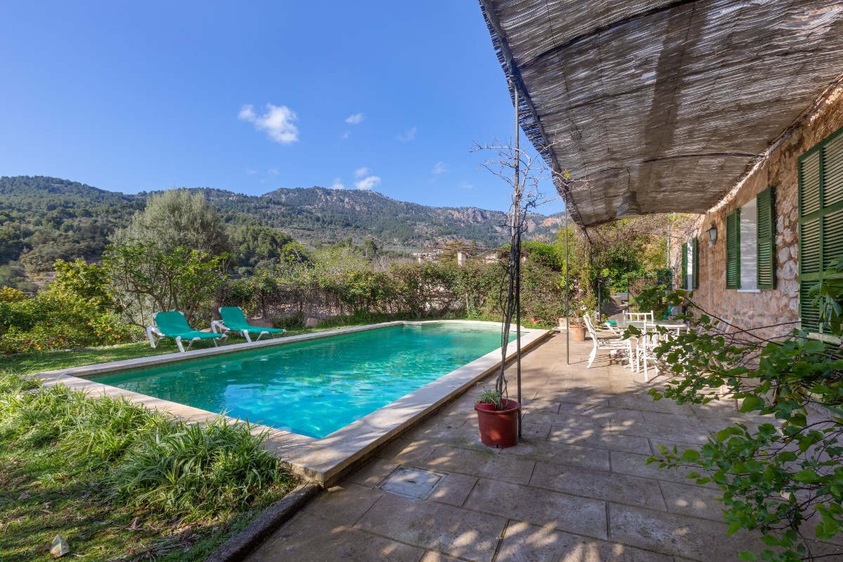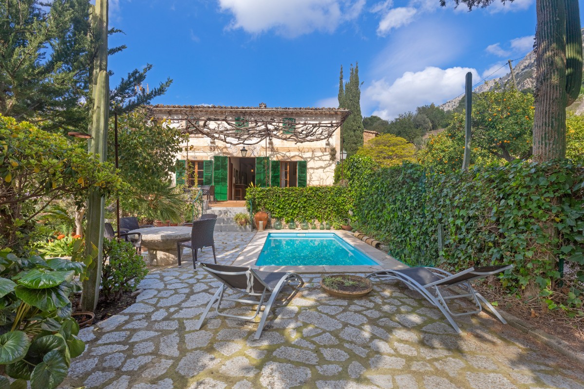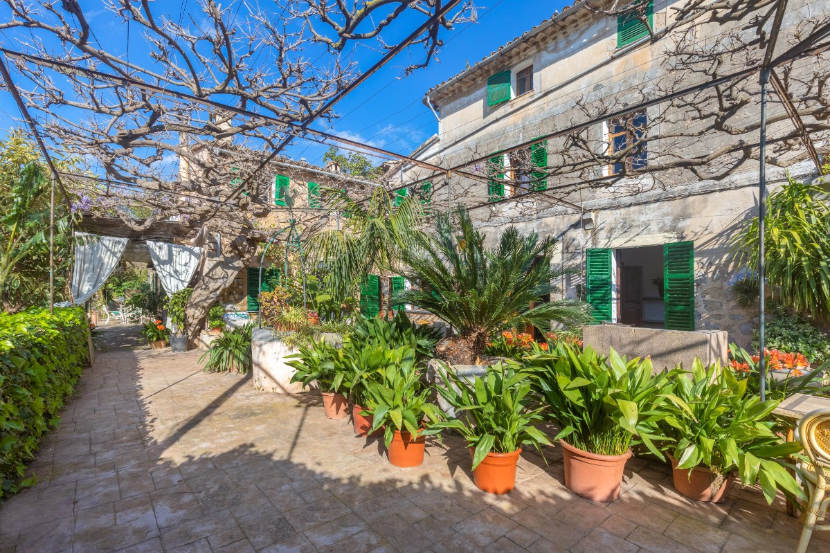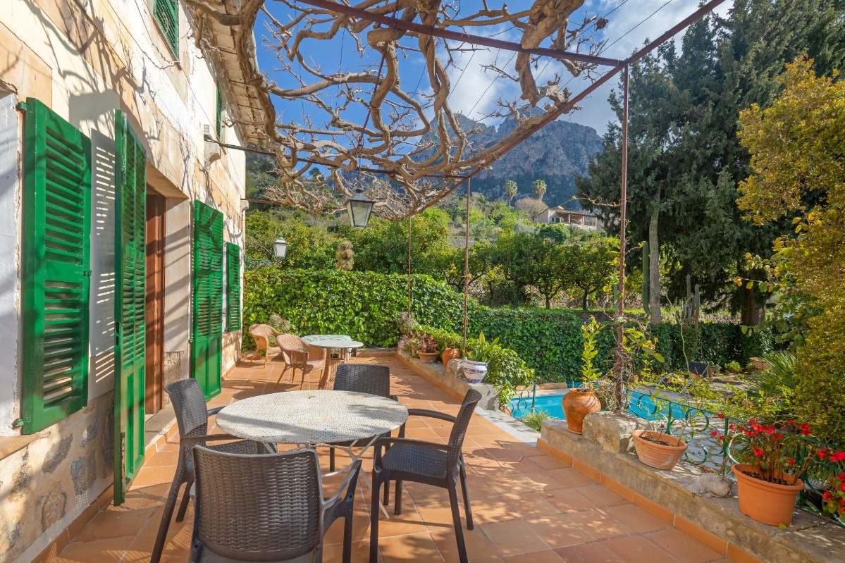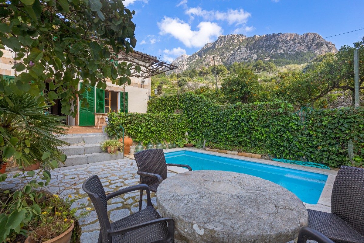 This Mallorcan finca is located in idyllic Biniaraix and consists of two adjoining, individual houses with their respective pools and a spacious plot with great fruit trees. The small plaza with its cafés and church square is just a few steps away on foot, and Fornalutx and Sóller are just a stroll away. The finca has been used in recent years as a rental property with a corresponding licence. Guests enjoy the tranquillity of the surroundings, the panoramic views of the valley and the charming Mallorcan style of the finca with its spacious garden and pools. Access is very easy and there are several parking spaces in the courtyard behind the houses. The courtyard is also used by another neighbouring finca, which does not affect the privacy of the country house for sale.