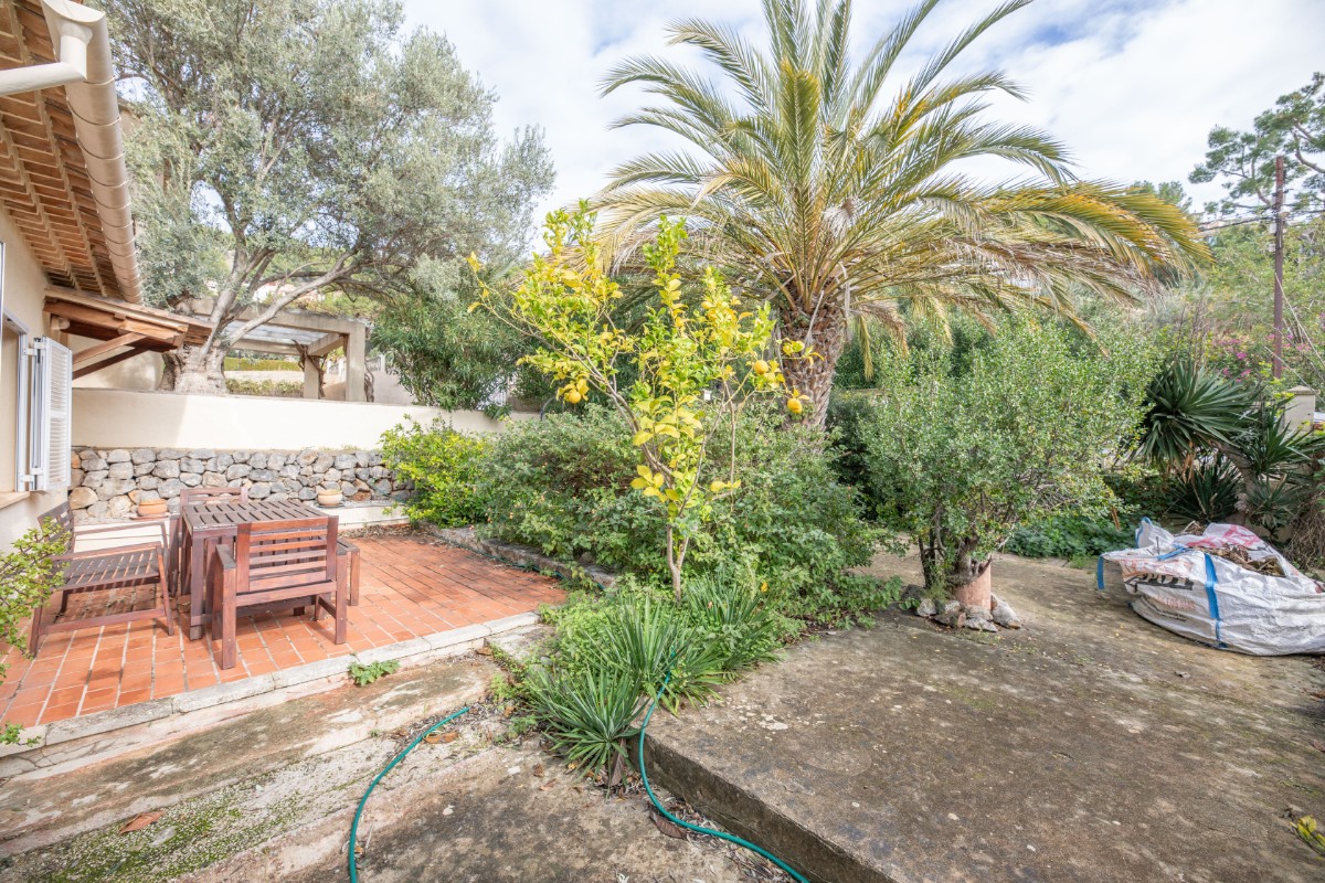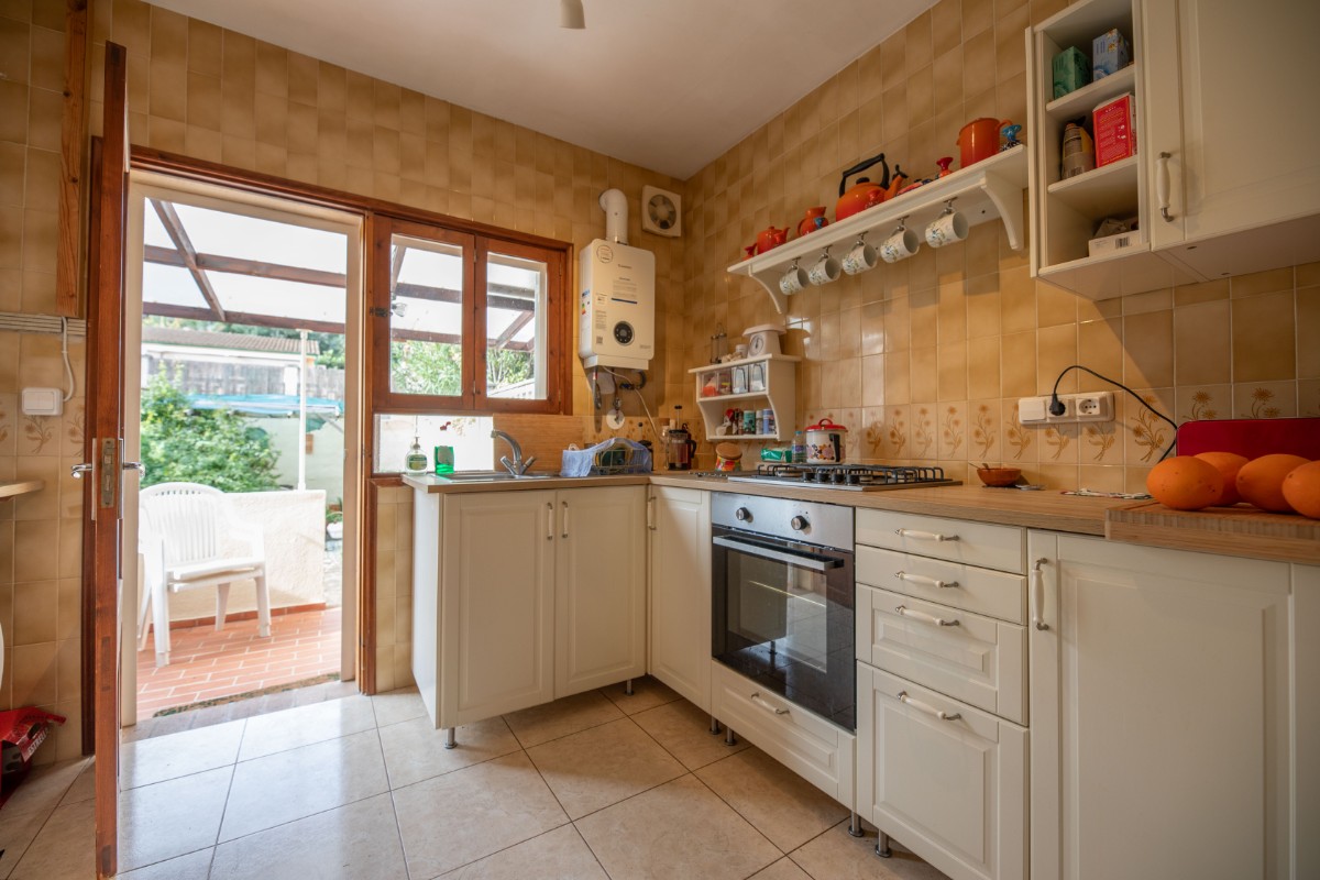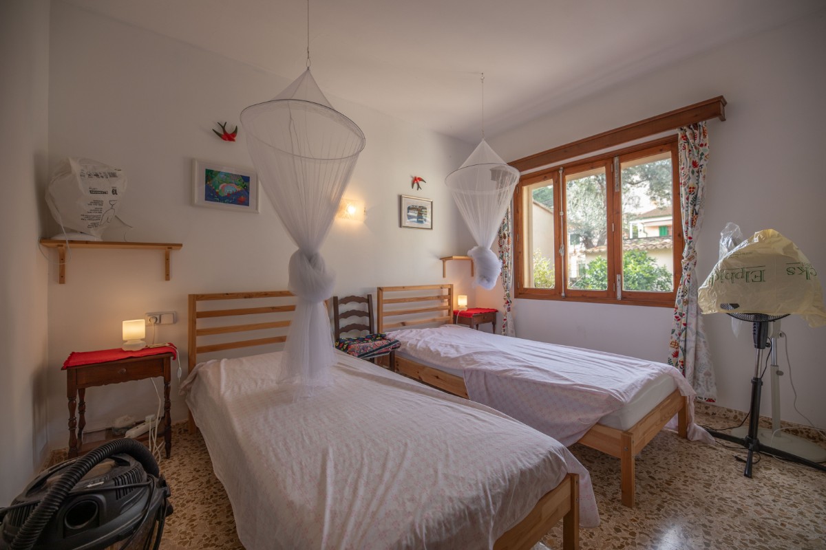 This fantastic sales property is nestled within a quiet neighbourhood, just a short walk away from the soothing waves of the beach and the vibrant buzz of the harbour town filled with shops and restaurants awaiting exploration. Palma is just a 35 minutes away in car and you can hop on the next bus stup withing walking distance of the house. This two-story semi-detached property offers comfort at its core, with ample space to spread out and make memories. There is a spacious living room with wood burner on the ground floor as well as one double bedroom with in build wardrobes, kitchen with Access to rear garden, and a small shower bathroom. On the upstairs área you find further two double bedrroms , as well with in build wardrobes and the master with Access out to a terrace and views over the neighbourhood and mountains. There is a full bathroom with window as well on this level. The qm are cleverly distributed and make i tan easy t olive house. Picture yourself enjoying lazy afternoons in the mallorcan sun with not just one, but two lovely garden spaces both at the front and rear of the house. This property offers the perfect blend of convenience with tranquility giving you the oportunity to enjoy mallorcan living.
