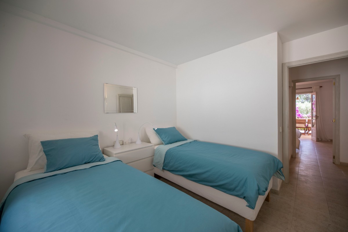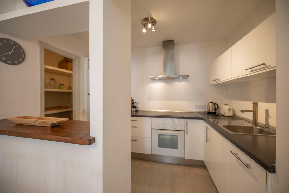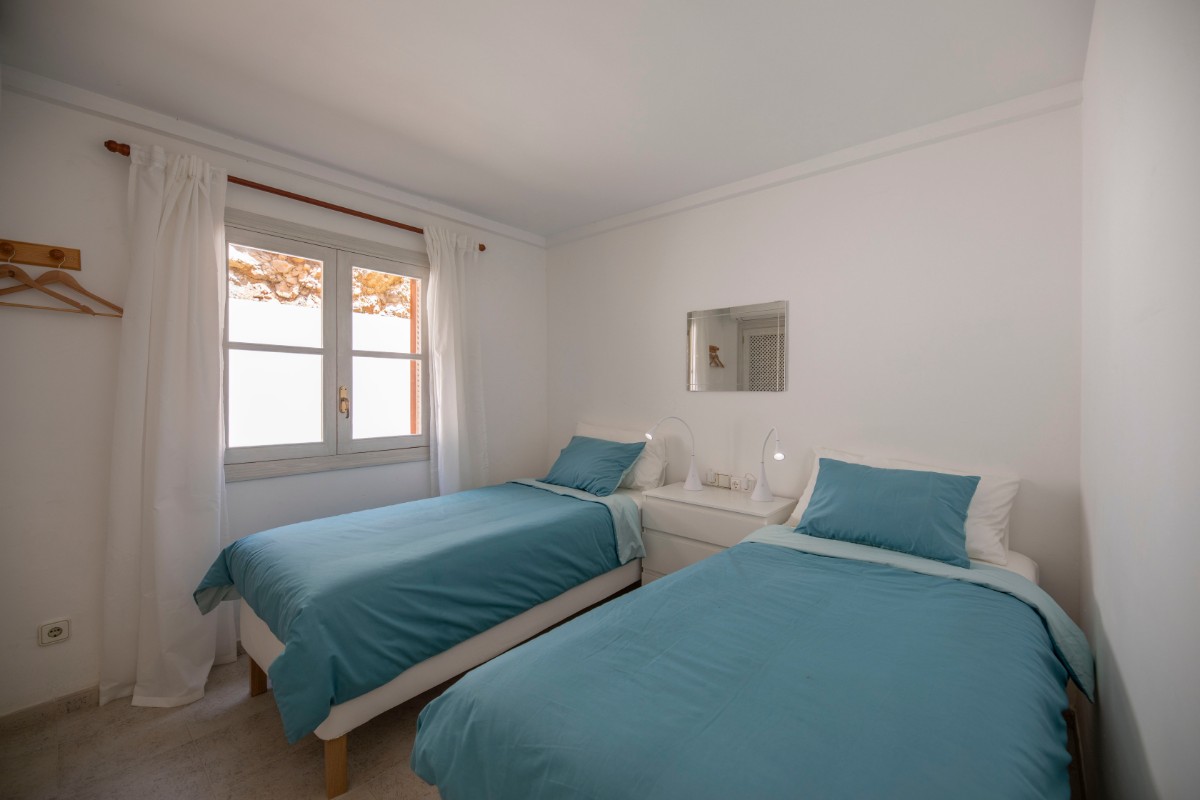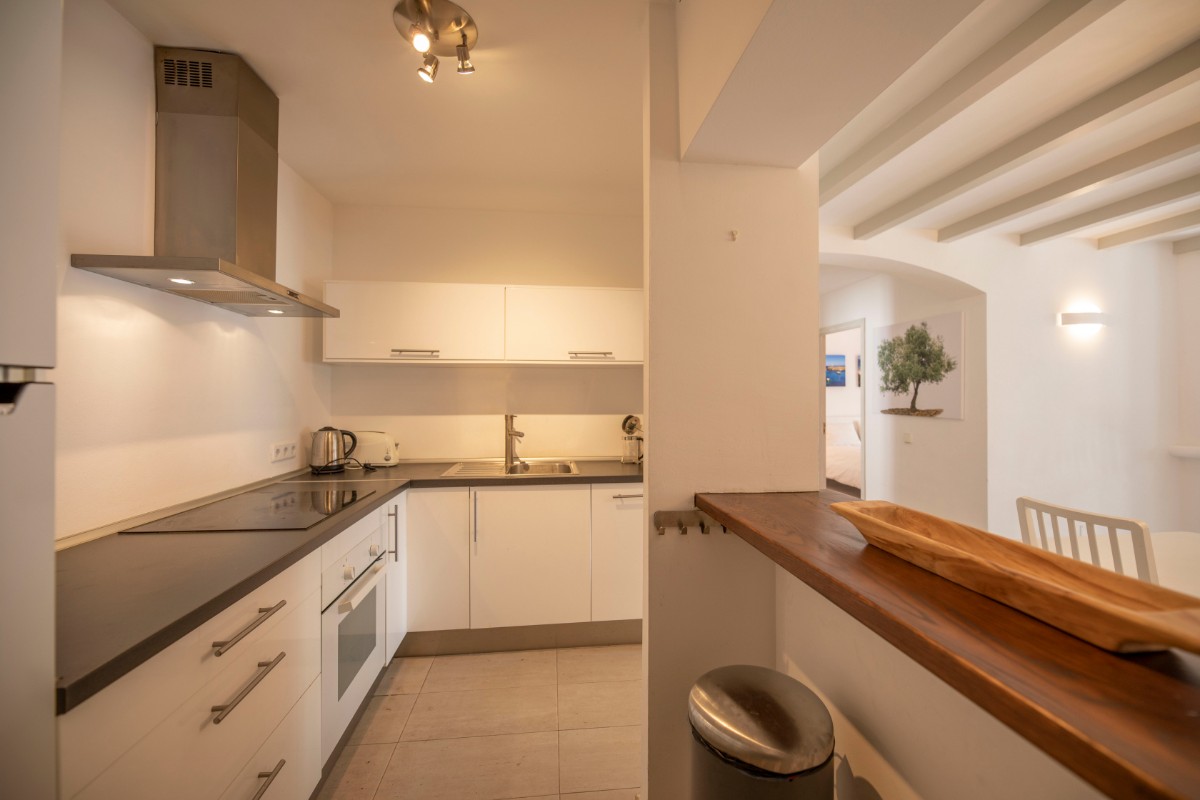 One of the highlights of the property is the large south-east facing terrace, accessible from both the living room and one of the bedrooms. It enjoys lovely mountain views and sunshine all year round, making it perfect for relaxing or outdoor dining. There are steps down from the terrace to a path that takes you to the residential road below, a shortcut to the beach and Port.
