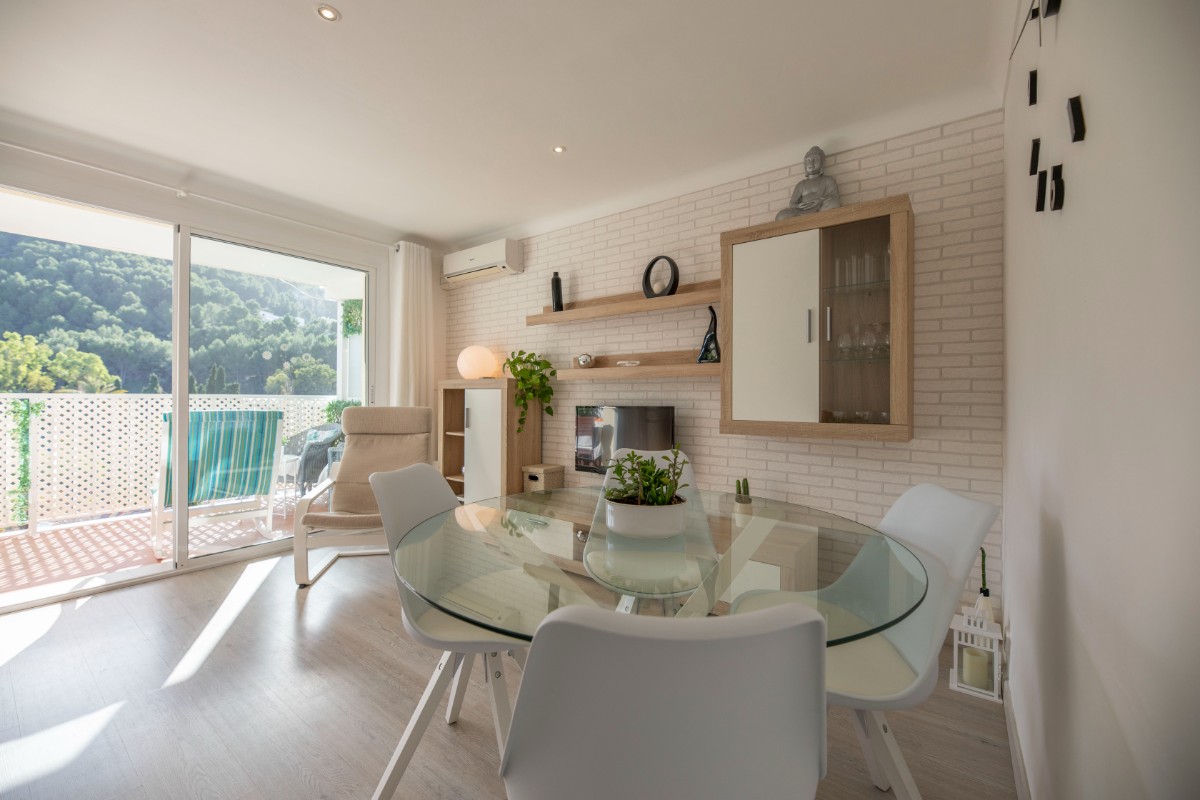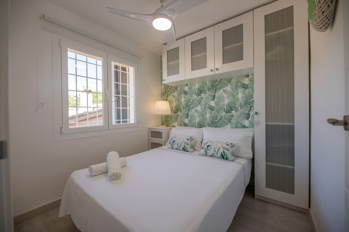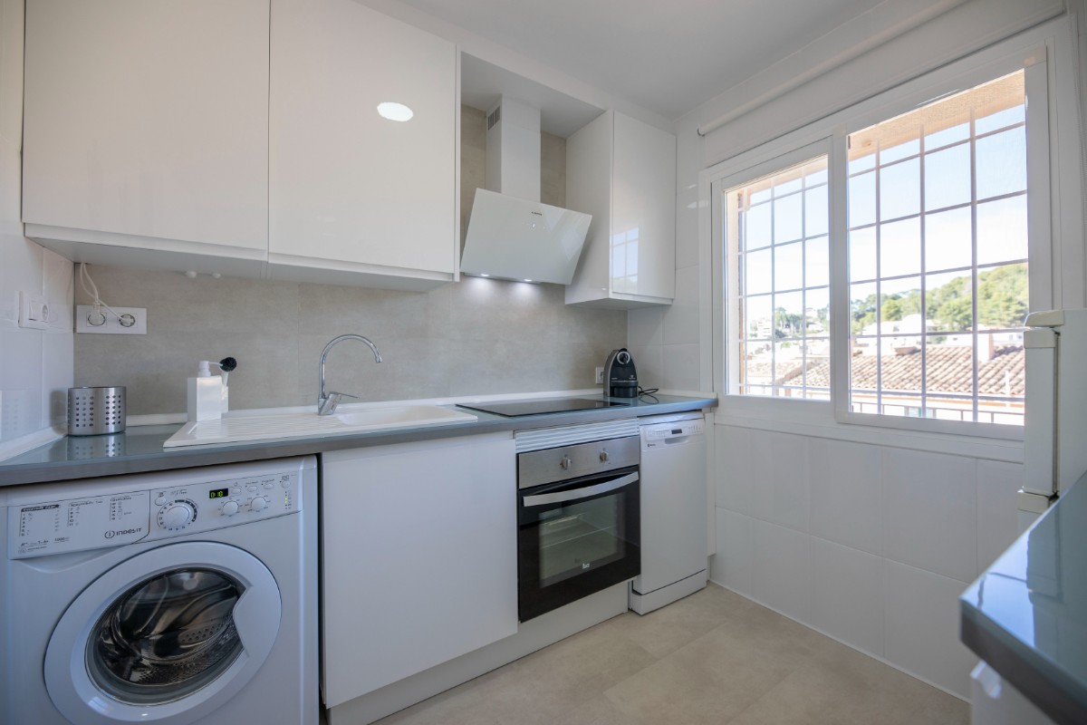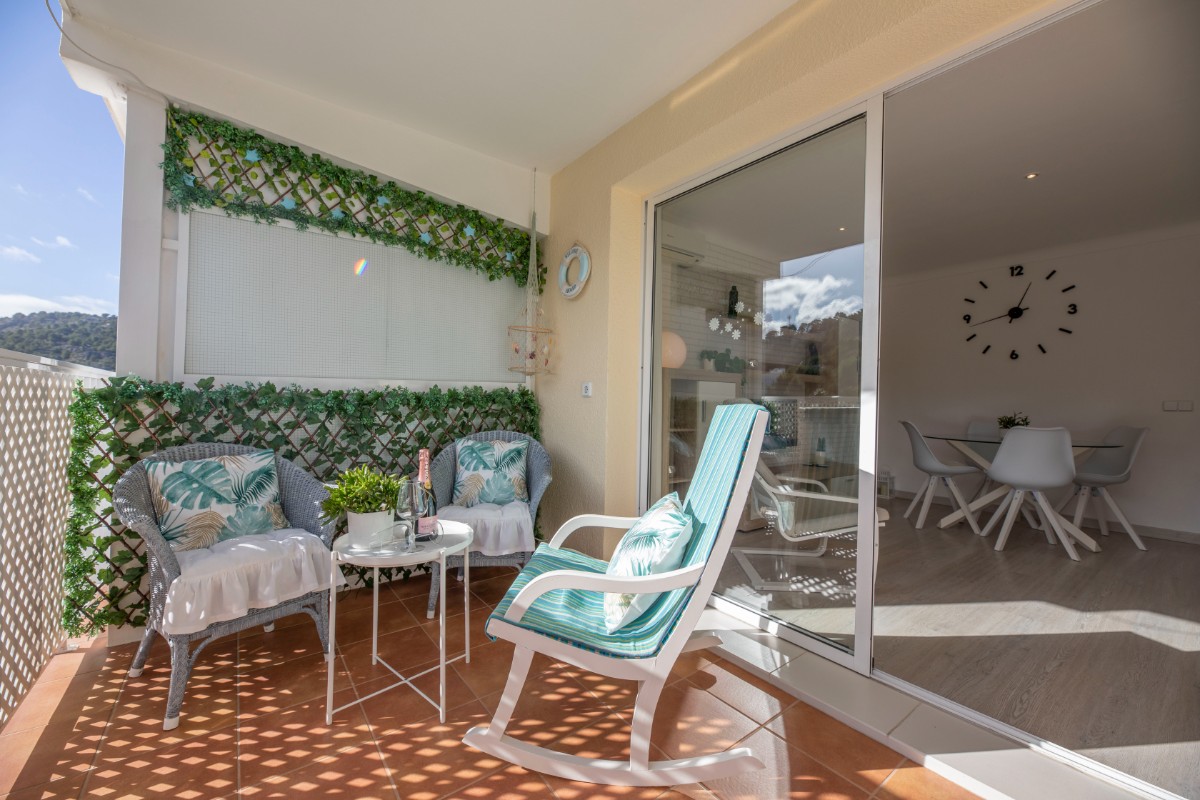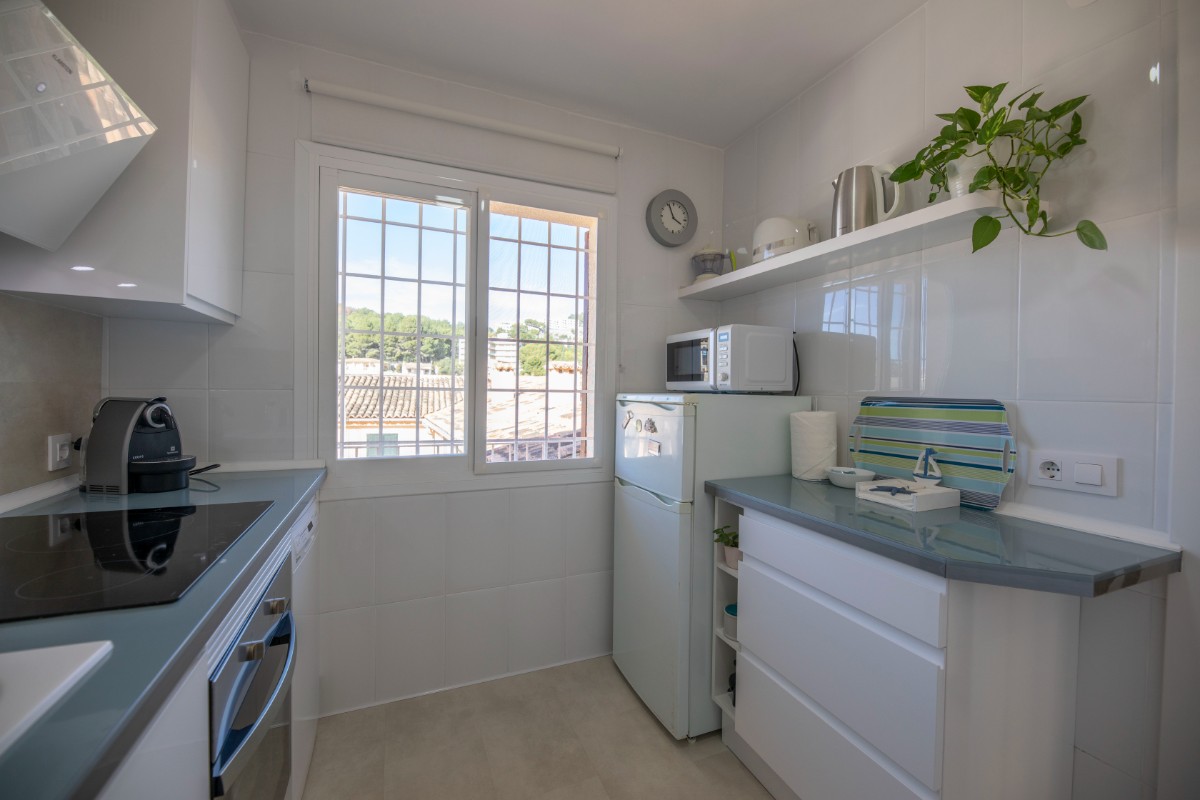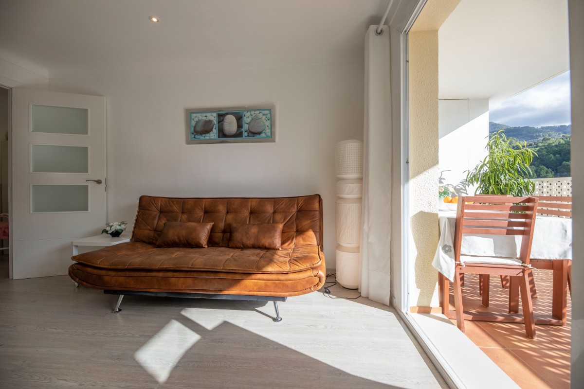 This modern renovated flat impresses with its location, only a few steps away from the beach of Port de Sóller. Once you have climbed the stairs to the 4th floor you are rewarded with a fantastic view of the historic finca of Hotel Es Port, as well as the surrounding mountains of the Tramuntana. The flat has a bedroom with a double bed of 1,50 x 2,00 m. The kitchen is very well equipped including washing machine and dishwasher. The bathroom has a shower. The living area is bright and friendly with WIFI and TV and leads directly onto the covered terrace, probably the most used space in this small flat. The terrace big enough for 4 to enjoy breakfast or simply round off the evening with a glass of wine. There is air conditioning in the living area and ceiling fan in the bedroom. This flat is a perfect base for both beach holidaymakers and hikers.