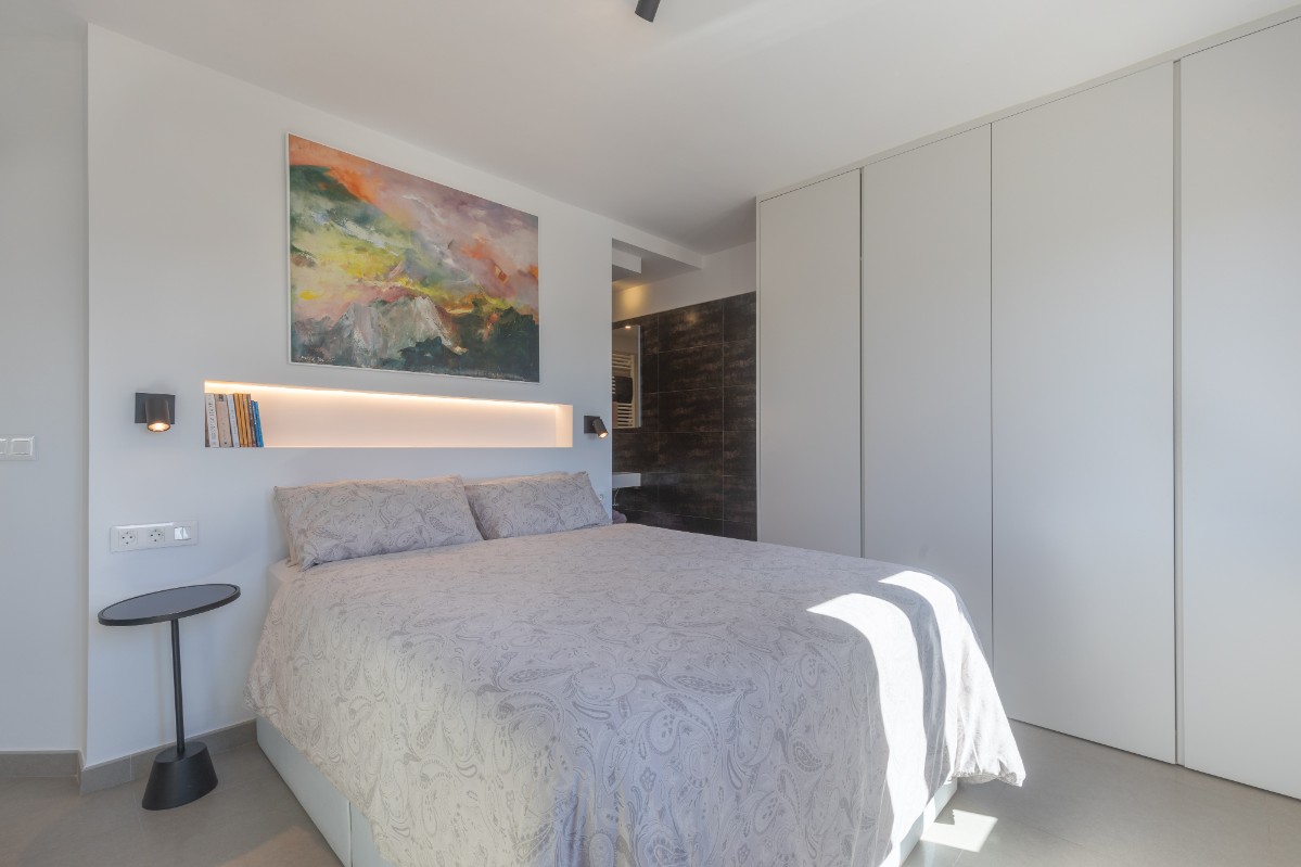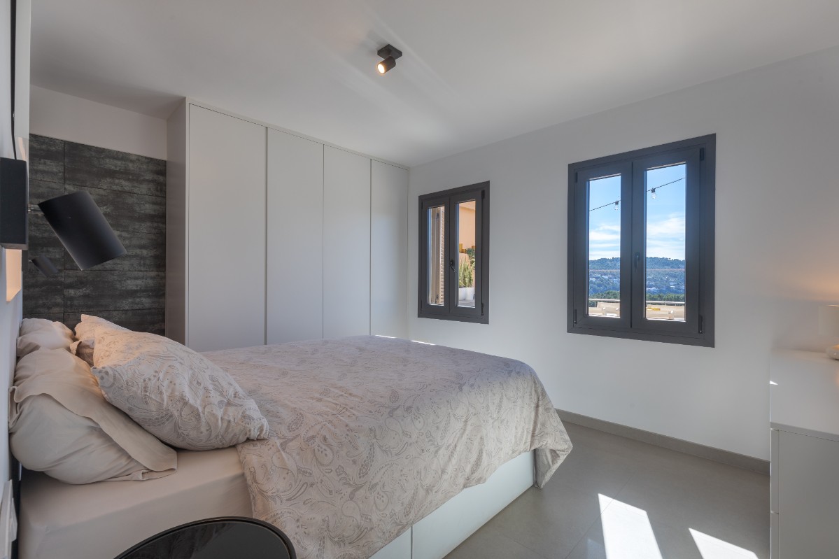 The highlight of the home is its expansive main terrace, unusually large for the area. It includes a complete outdoor kitchen with barbecue, generous space for gatherings, and two electric awnings providing ample shade. From this vantage point, the views of the harbor are simply spectacular.