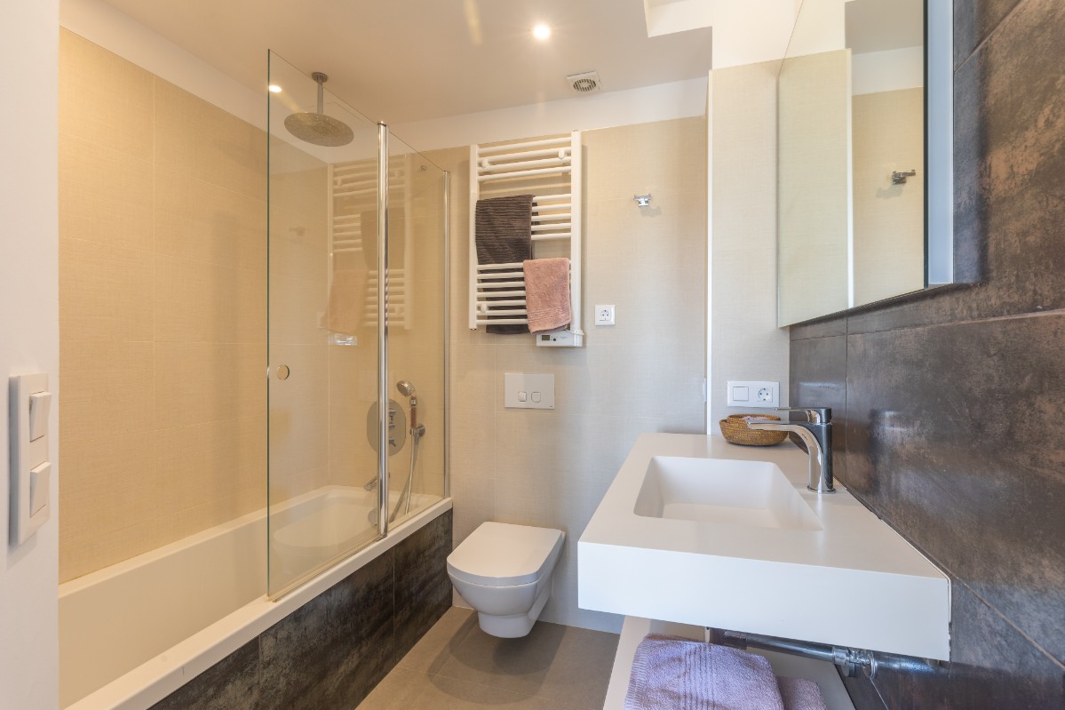 The apartment offers a master bedroom with custom-built wardrobes and a private en-suite bathroom with bathtub/shower over. A second bathroom with shower is conveniently located near the entrance, perfect for guests. There is also an additional guest bedroom and a utility room with washer-dryer and extra storage.