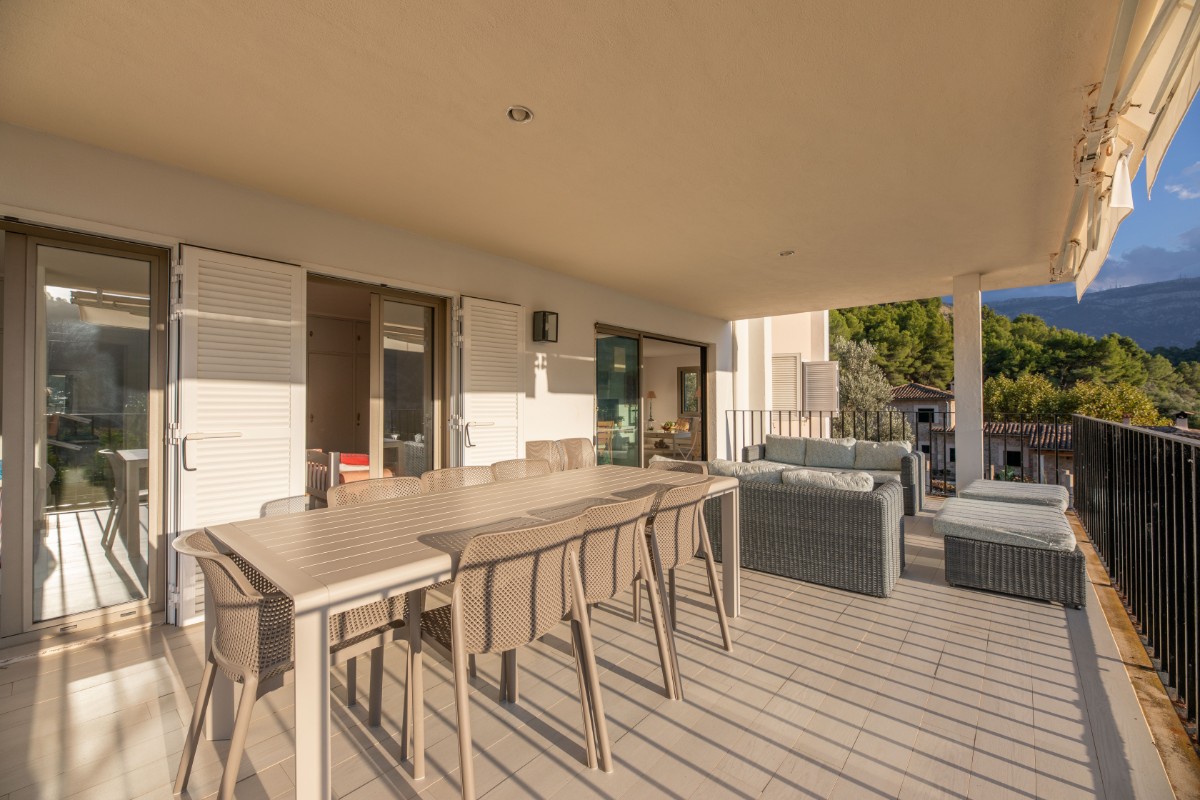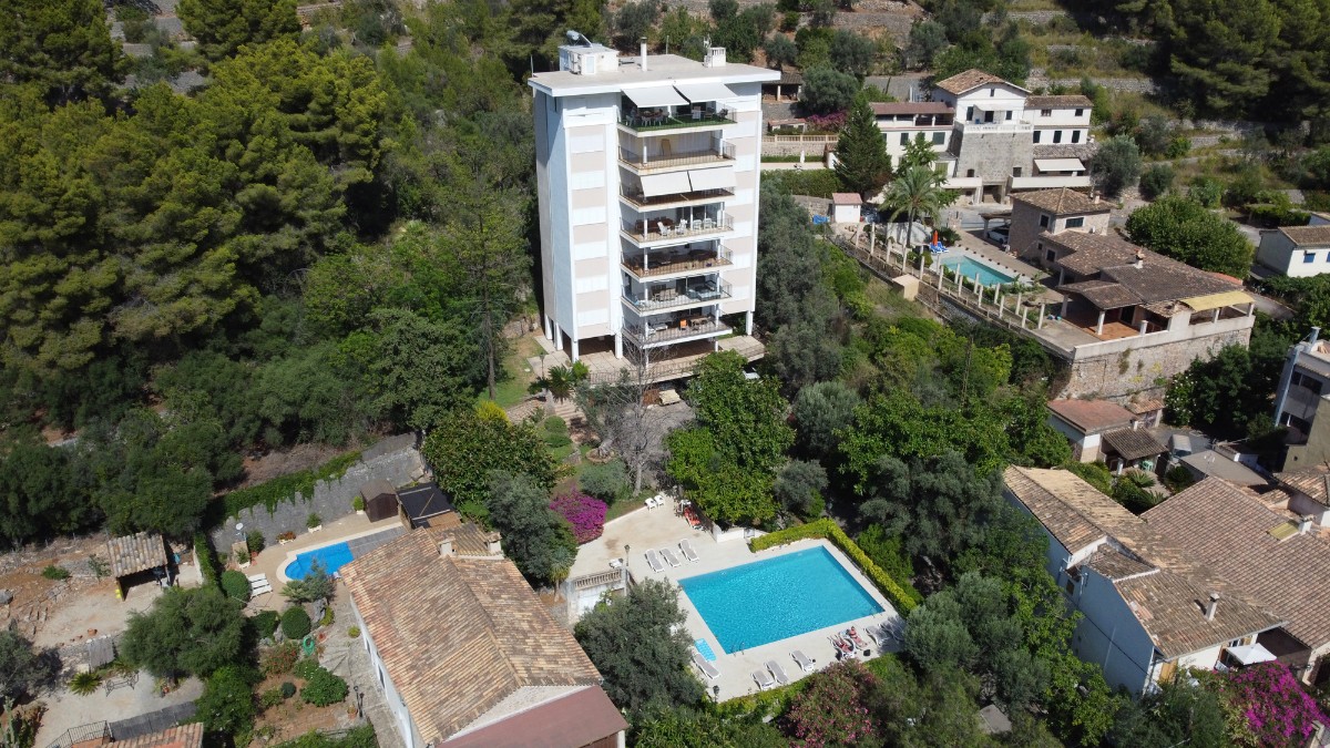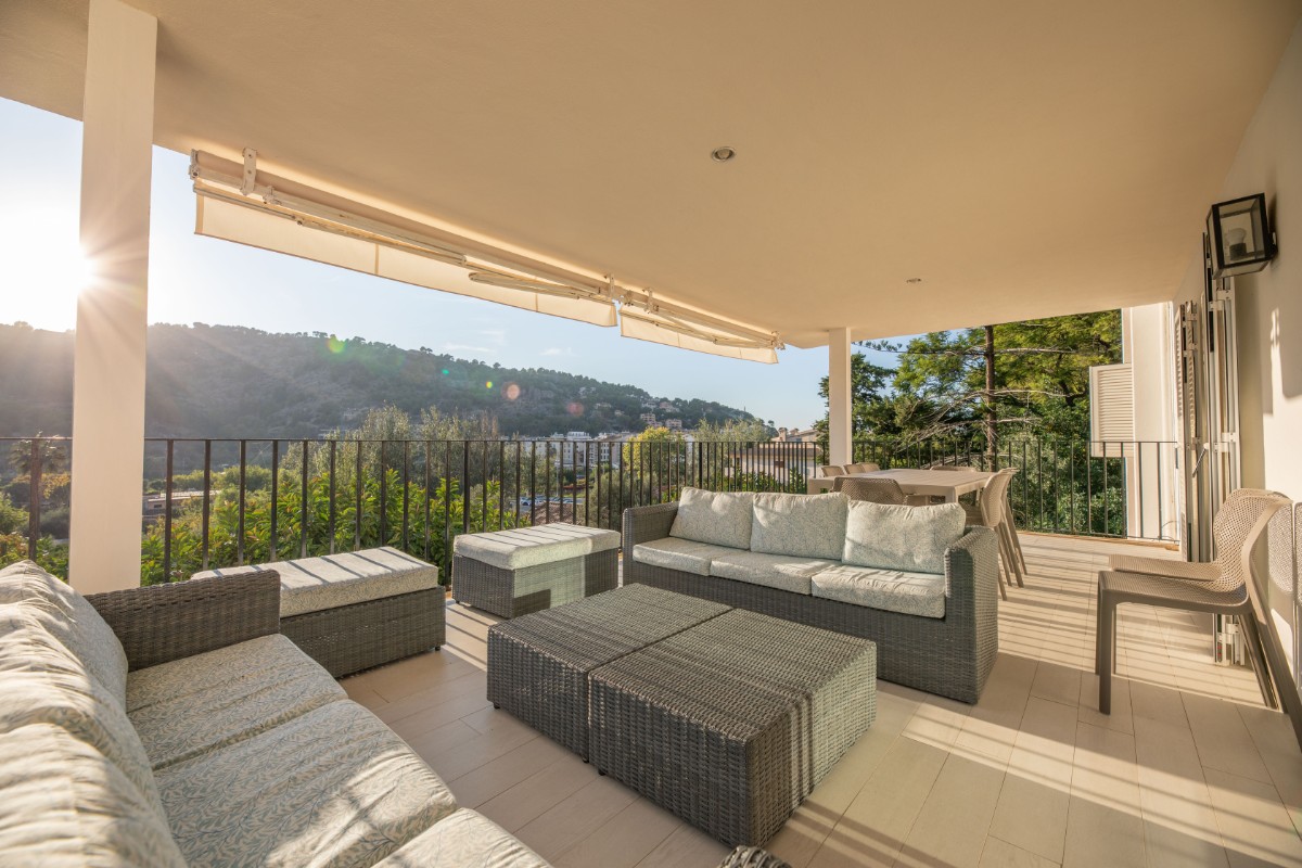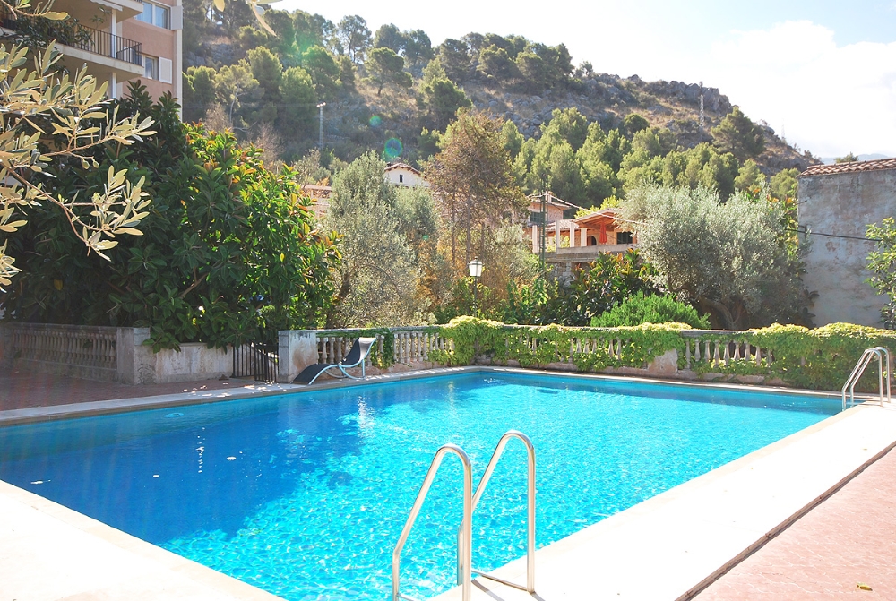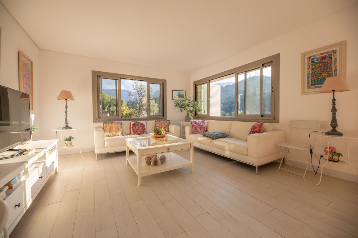 The apartment is located at only 200 metres from the first line of Port de Soller with its sandy beach. The building has seven flats sharing a huge plot with lots of parking and a good size pool area. Located on the second floor it enjoys a huge covered terrace where to live most of the time! Nice views to the mountains are available from the terrace and the light and bright living area is well equipped and nicely furnished. There are three double bedrooms with double beds and one more in another dobule bedrooms. The kitchen is totally equipped and has access to a back terrace where there is a washing machine and a dryer. There is hot and cold A/C all over the flat and there is free WIFI available. The elevator, the pool area and parking are also very convenient to make the flat very comfortable.