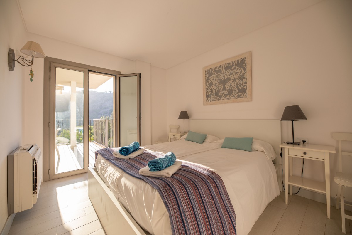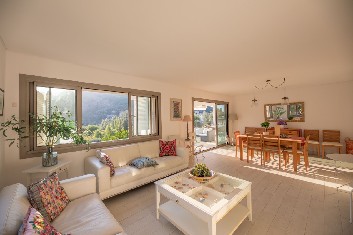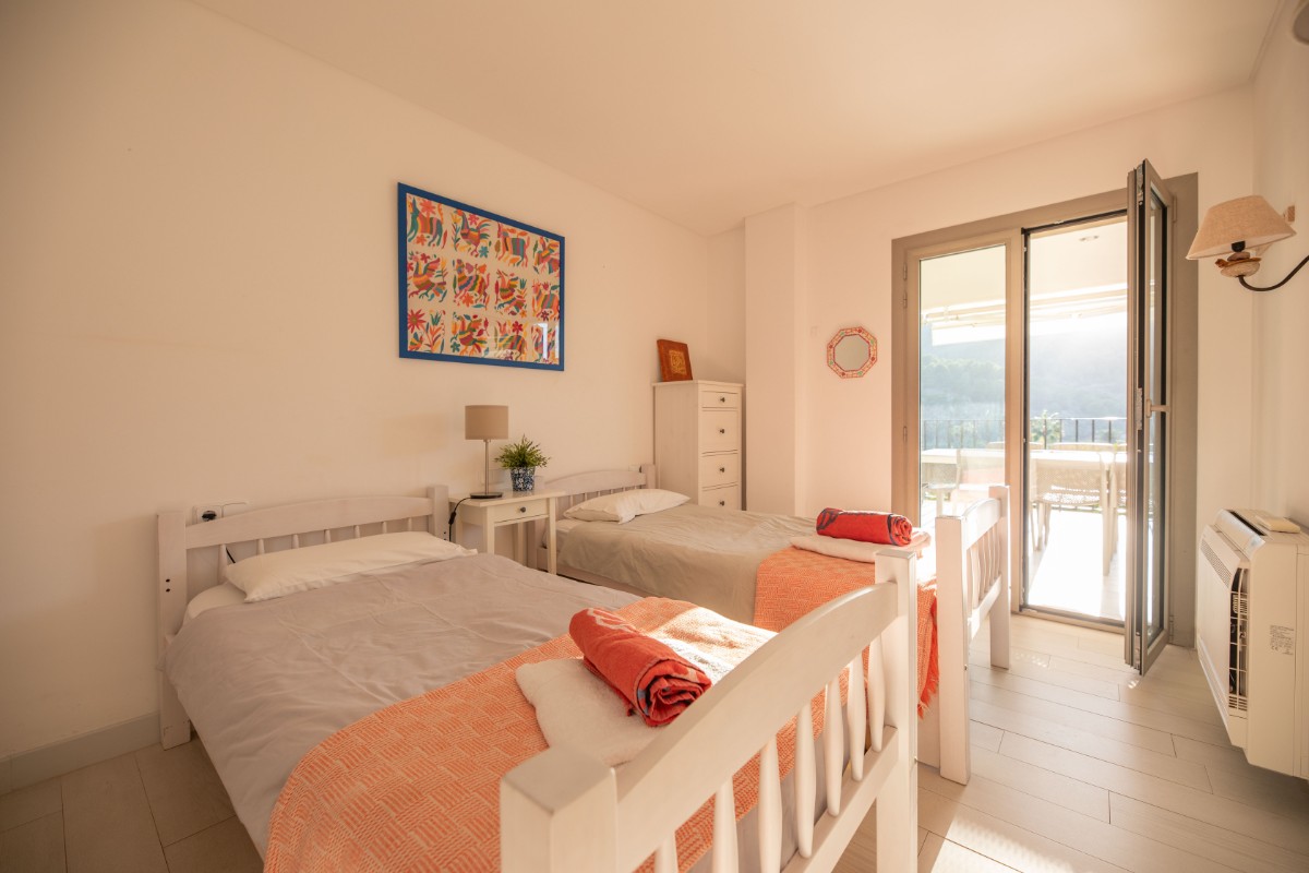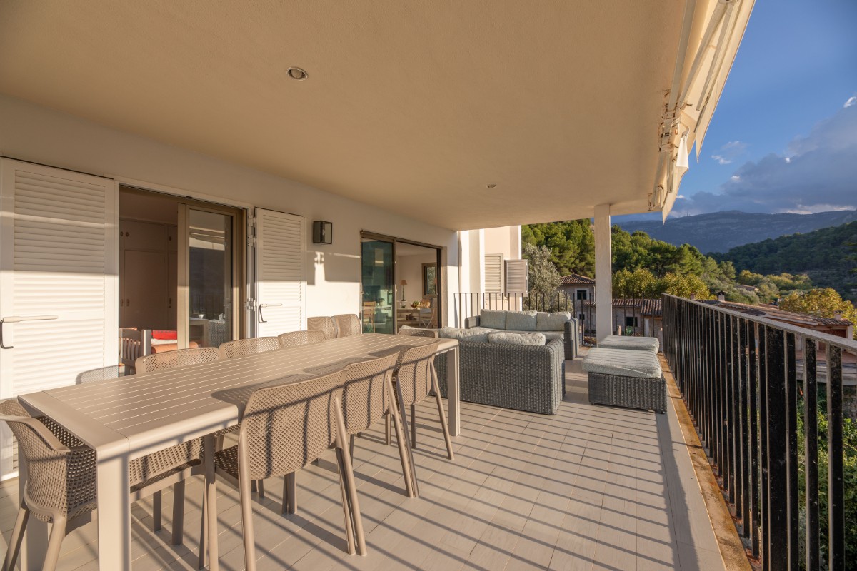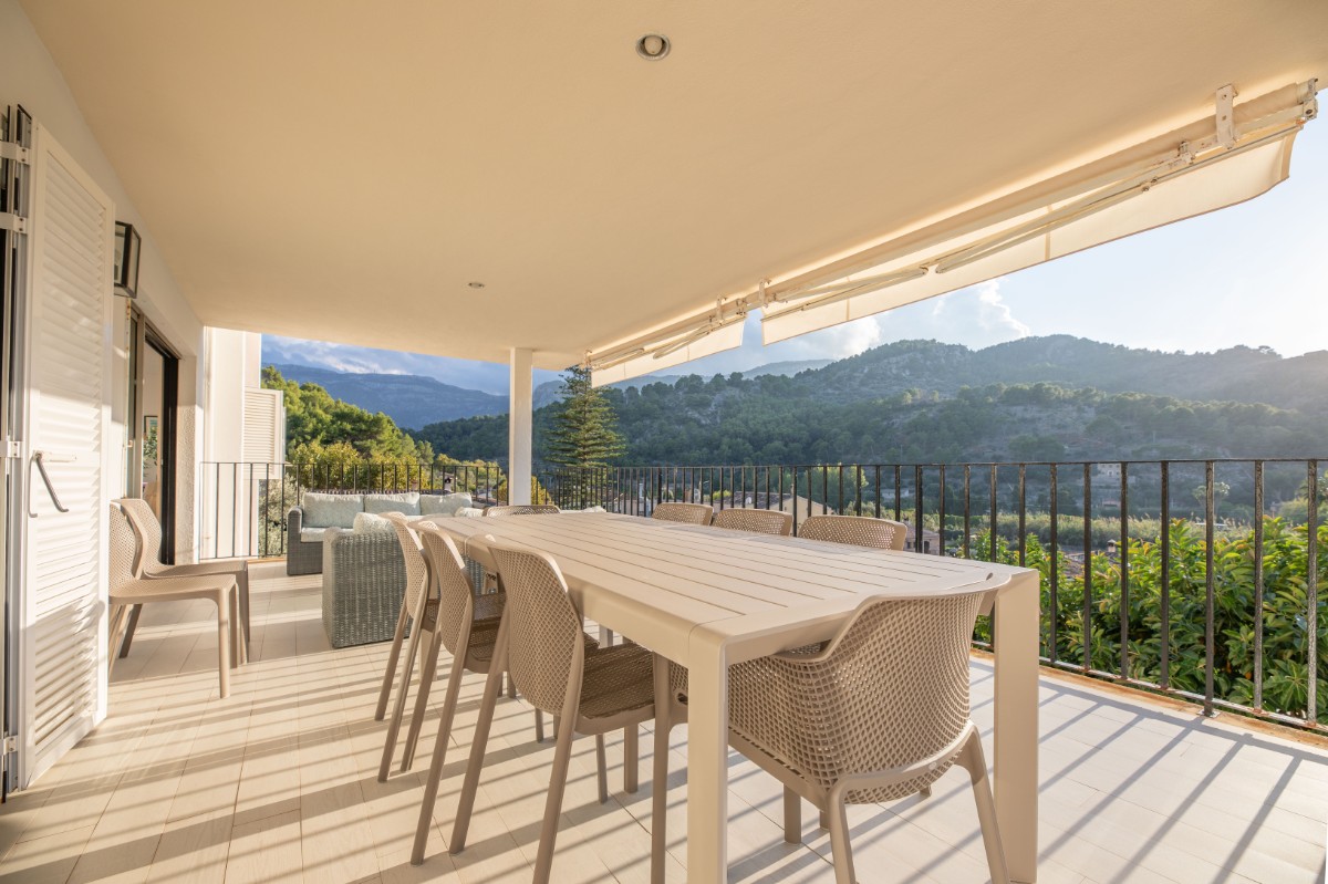 The apartment is located at only 200 metres from the first line of Port de Soller with its sandy beach. The building has seven flats sharing a huge plot with lots of parking and a good size pool area. Located on the second floor it enjoys a huge covered terrace where to live most of the time! Nice views to the mountains are available from the terrace and the light and bright living area is well equipped and nicely furnished. There are three double bedrooms with double beds and one more in another dobule bedrooms. The kitchen is totally equipped and has access to a back terrace where there is a washing machine and a dryer. There is hot and cold A/C all over the flat and there is free WIFI available. The elevator, the pool area and parking are also very convenient to make the flat very comfortable.