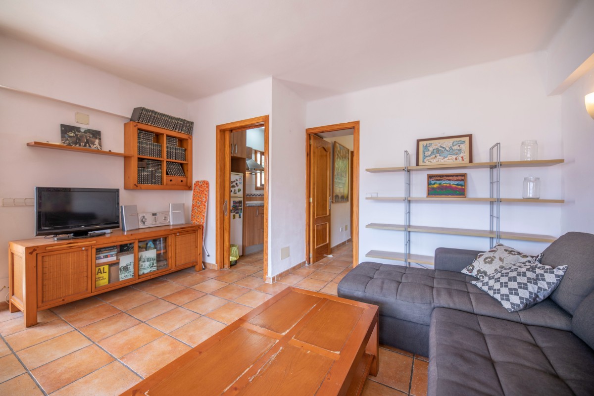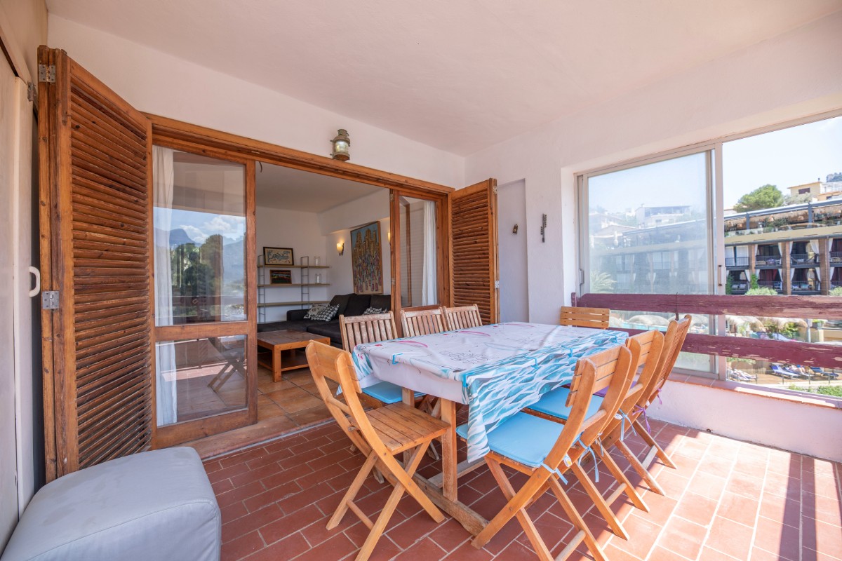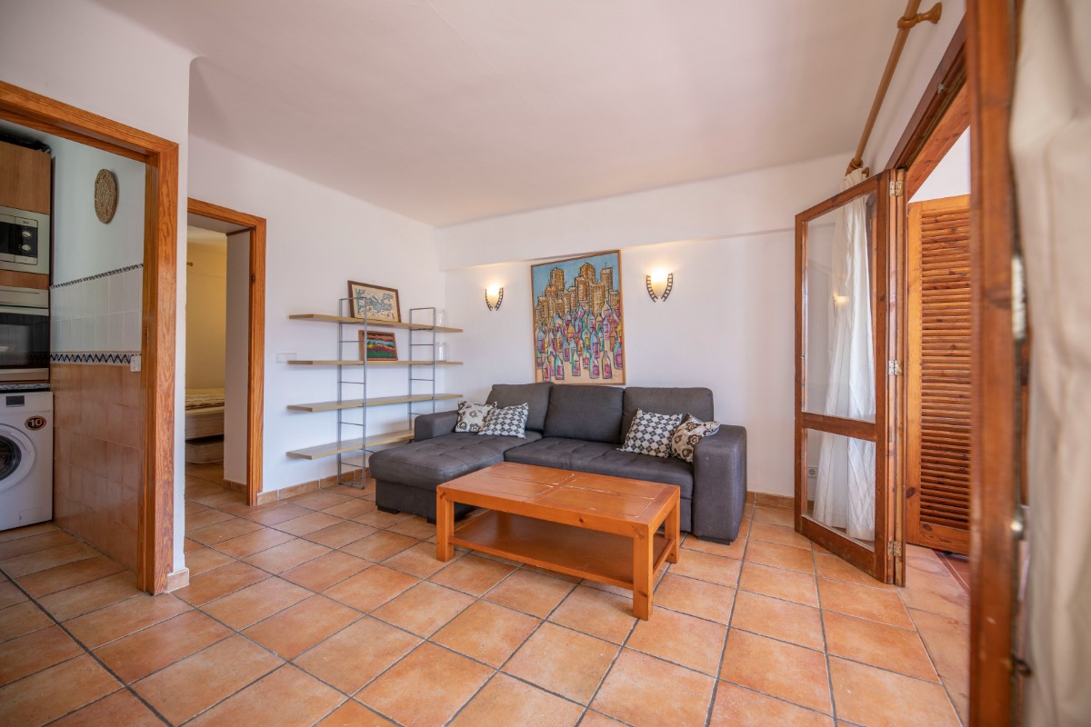 This flat is located on the 4th floor of a block of flats. The flat has a bedroom, a bathroom with shower, a living and dining room with access to the terrace and a small kitchen. From the terrace you have a wonderful view of the harbour. The beach, restaurants and cafeterias are only a few steps away. There is no lift. Two new air conditioning units have recently been installed and the window front has been replaced with new white PVC ones. The flat can be given a completely new modern feel with a new kitchen and bathroom. The location is worth this investment. It should be mentioned that a facade renovation is planned for winter 2024, which will give the entire apartment building a new, well-kept appearance. Stair railings have already been replaced.