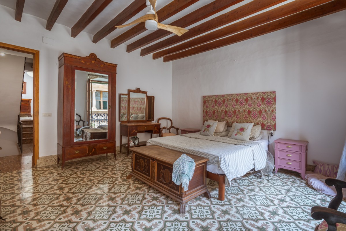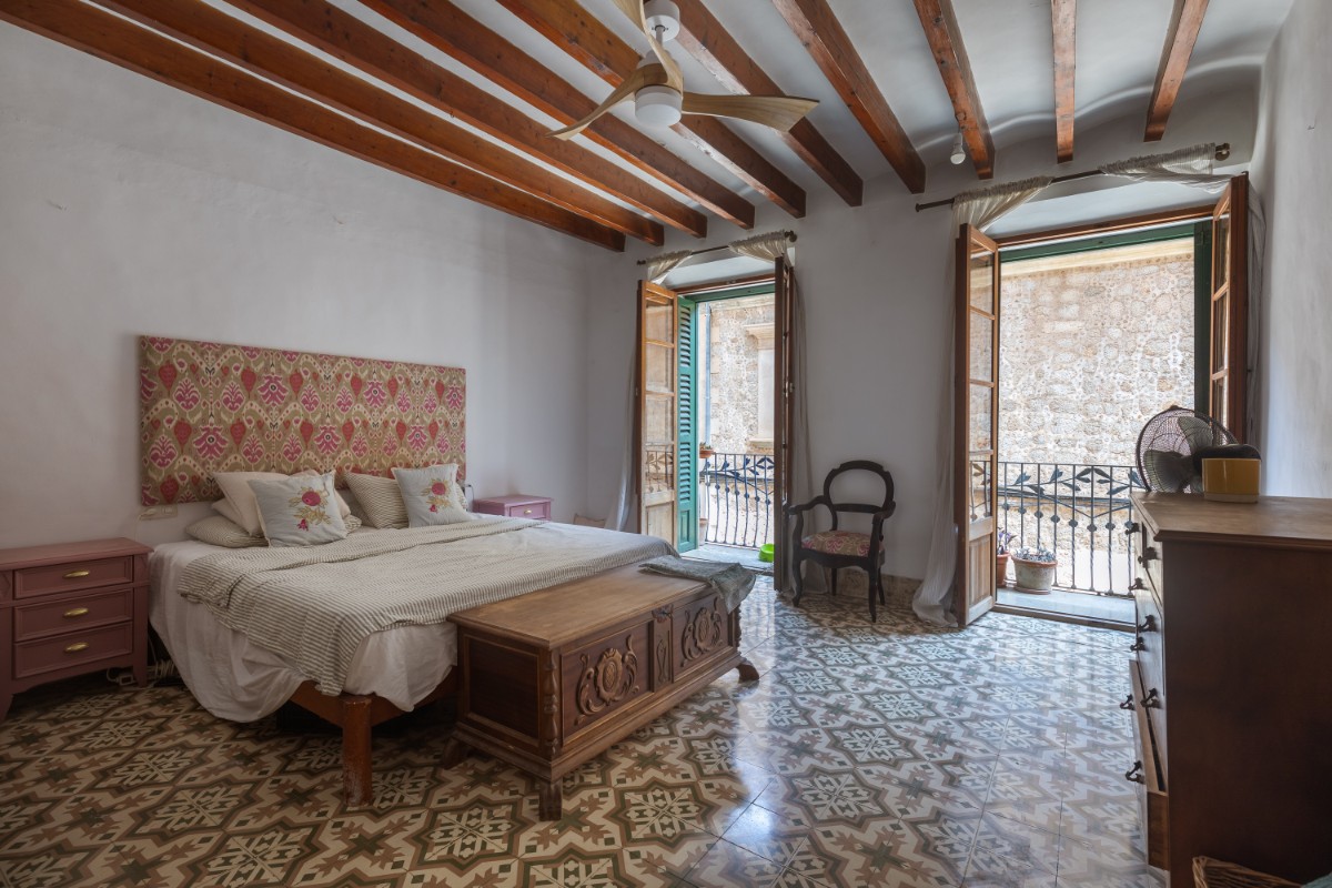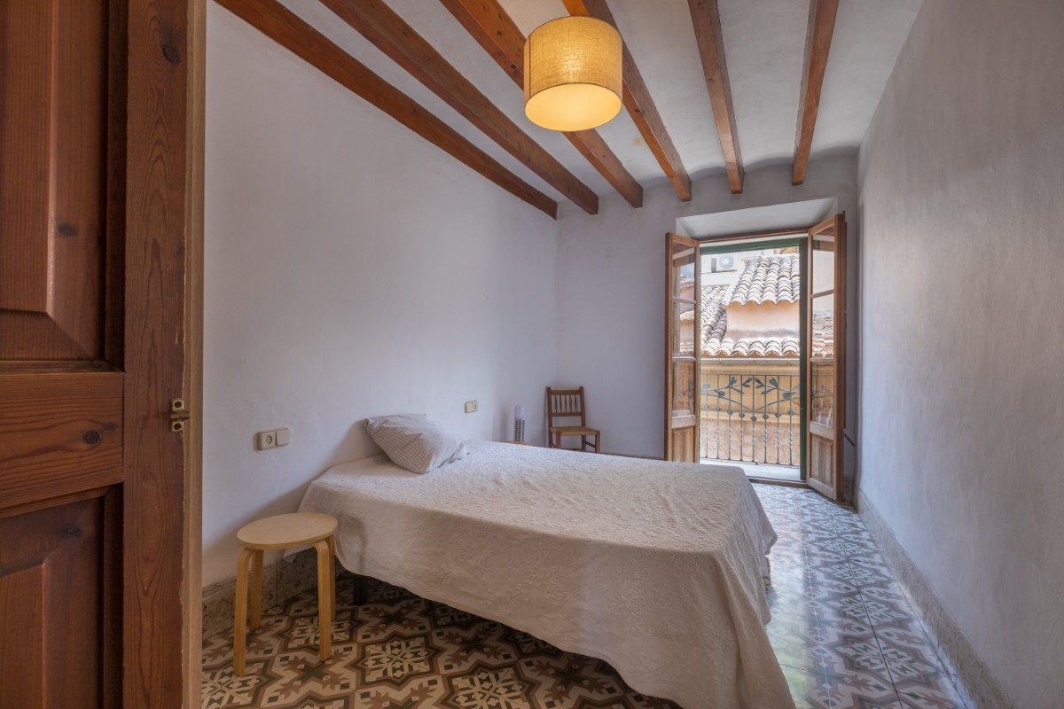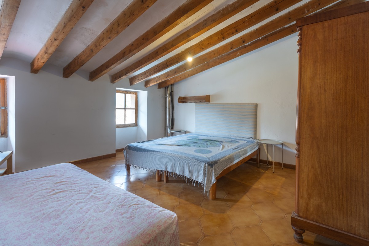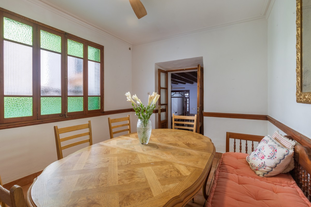 Located in the old town of Sóller you find this spacious townhouse over 4 floors with terrace on the first floor overlooking the top of the Sóller roofs and with south orientation. The house has not been habited for a while but it offers great potential. Entering the house you have a mallorcan entrada and to the left a small office room. Few steps up from the hall , which also leads out to a small patio and cellar, you have in a row a dining room, small guest toielt and at the end the kitchen with access out again to the patio and few steps down to cellar area. On the first floor there is a very spacious room which could be bedroom or living room , and a further smaller bedroom. On the second floor one finds three bedrooms more , as well as the access out to the terrace . The top floor has two further rooms which could give space for bedrooms or second living area.