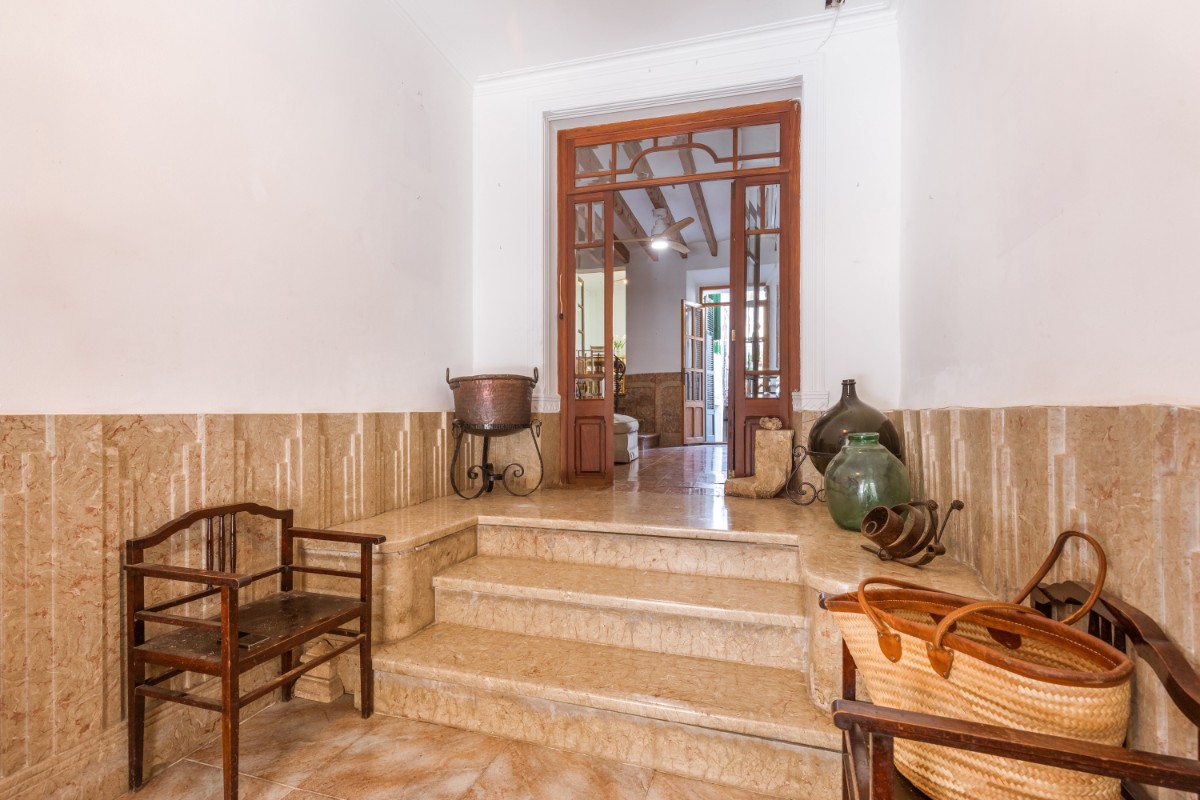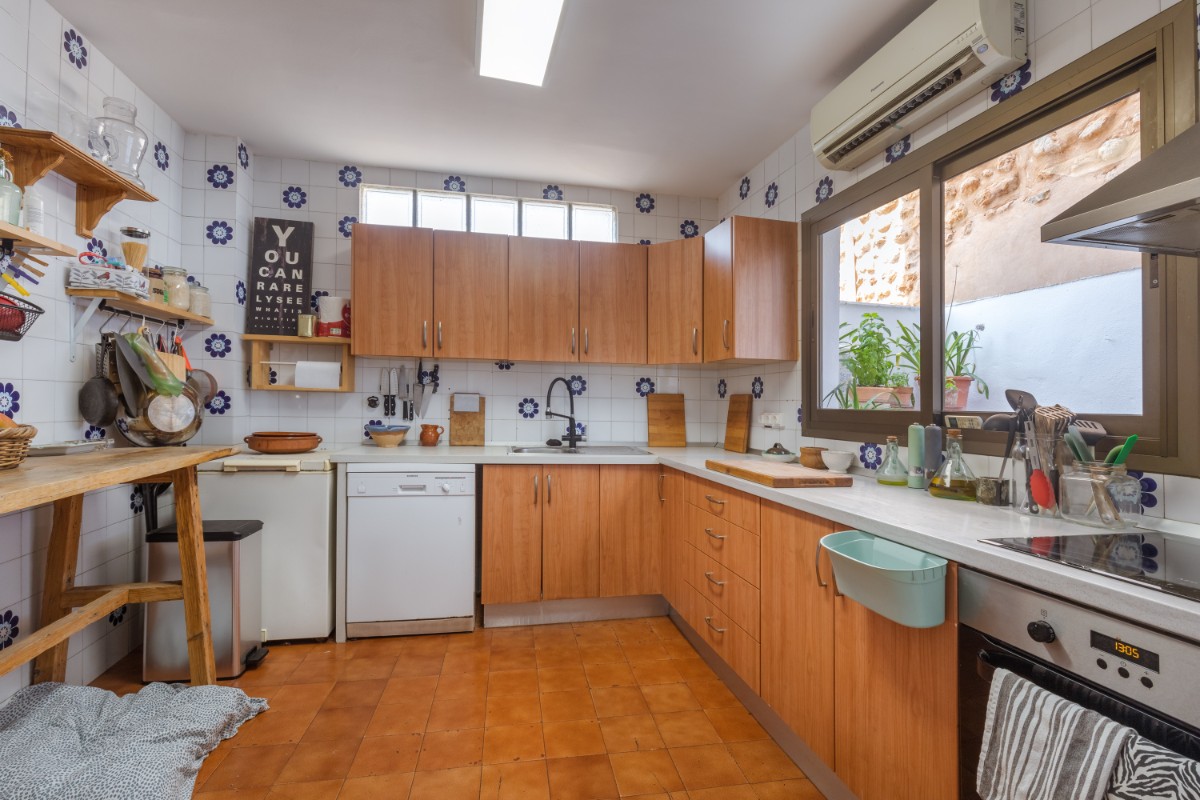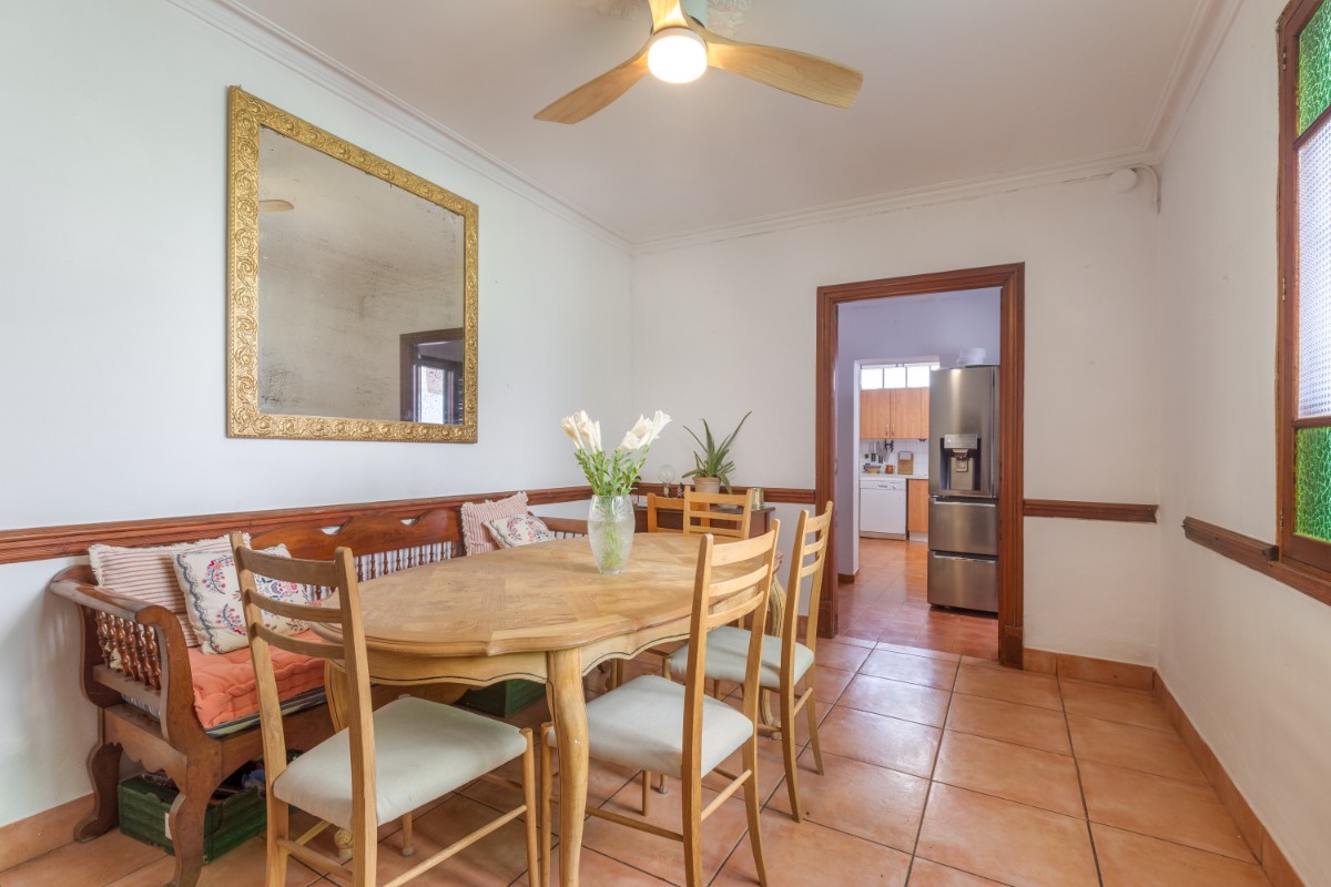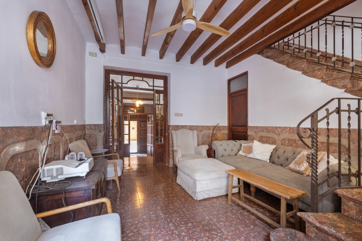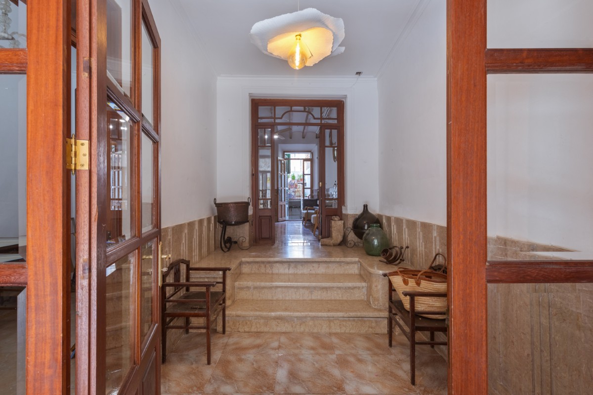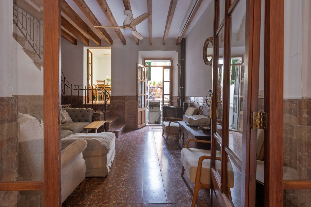 Located in the old town of Sóller you find this spacious townhouse over 4 floors with terrace on the first floor overlooking the top of the Sóller roofs and with south orientation. The house has not been habited for a while but it offers great potential. Entering the house you have a mallorcan entrada and to the left a small office room. Few steps up from the hall , which also leads out to a small patio and cellar, you have in a row a dining room, small guest toielt and at the end the kitchen with access out again to the patio and few steps down to cellar area. On the first floor there is a very spacious room which could be bedroom or living room , and a further smaller bedroom. On the second floor one finds three bedrooms more , as well as the access out to the terrace . The top floor has two further rooms which could give space for bedrooms or second living area.