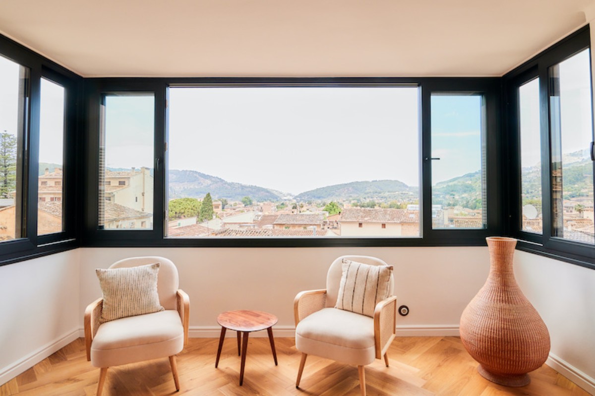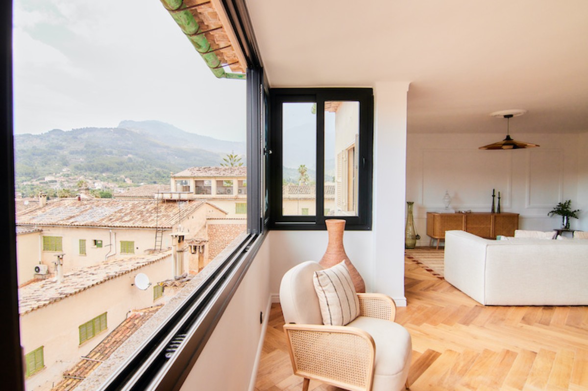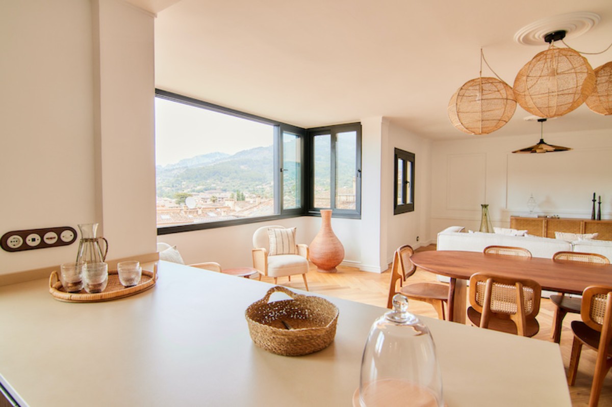 Impressive renovated penthouse in the heart of Sóller. This fantastic property has been refurbished with top-quality finishes, offering practical, beautiful spaces with the utmost comfort. Located on the fourth floor, this penthouse has 156 m², featuring a welcoming entrance followed by three double bedrooms, all equipped with built-in wardrobes. The living room is spacious, with stunning mountain views. The highlight is the open kitchen with a central island, providing a panoramic view of the living area. Additionally, there is a room that can function as an office with an integrated walk-in wardrobe. The apartment includes two full bathrooms and a laundry area. The flooring is made of solid oak parquet, the kitchen furniture is made of walnut with a ceramic countertop, and the switches are crafted from solid wood and porcelain by FONTINI. Even the crockery and cutlery have been carefully selected. It is located on an emblematic street in Sóller, just a few minutes from the center.