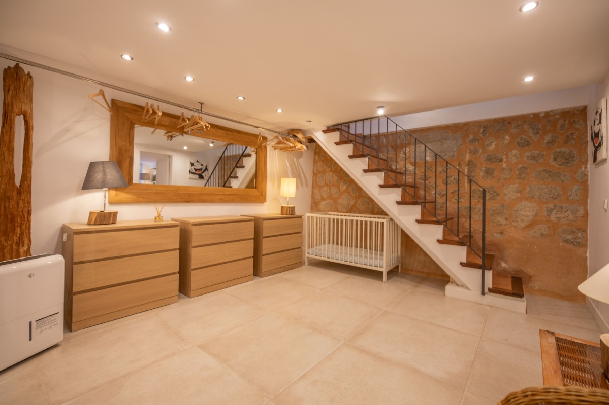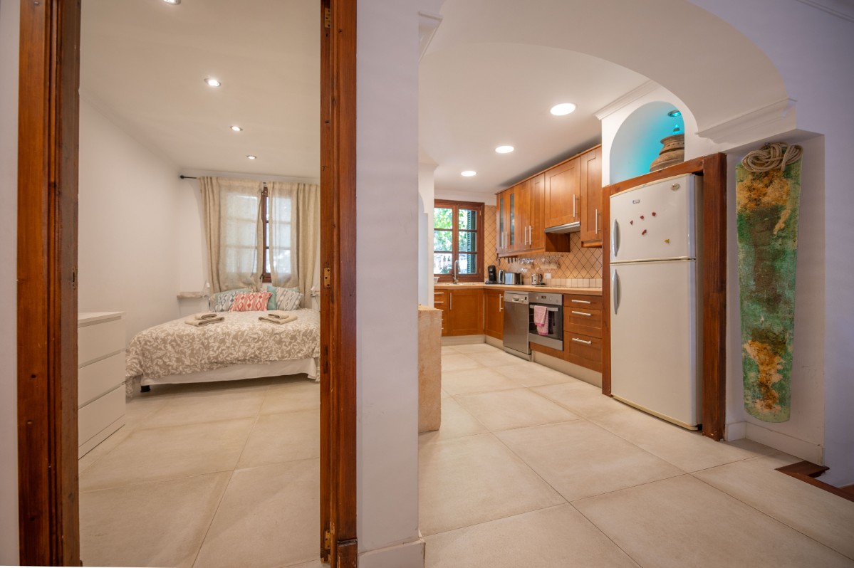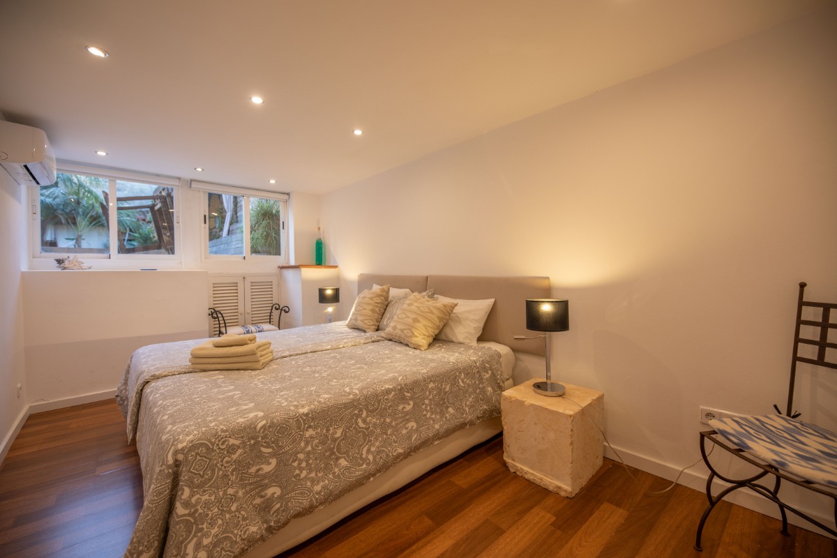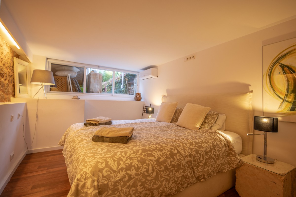 This spacious two-storey apartment occupies the ground floor of a townhouse shared by only two parties, located in a quiet residential area in the heart of Sóller. The private garden with a refreshing pool (6 x 2.5 m) and an additional outdoor kitchen offers the perfect setting to relax and enjoy the Mediterranean lifestyle. On the ground floor, the apartment features a bright living and dining area with an open-plan kitchen, a small bedroom, and a bathroom. A few steps lead down to the lovely garden. The lower level includes two double bedrooms and a large bathroom with a walk-in shower. Just a five-minute walk takes you to the main square of historic Sóller, famous for its vintage wooden tram that winds through orange groves and olive trees. The picturesque town of Sóller is increasingly popular, so the lively streets reflect the charm and rhythm of the season. The apartment is equipped with hot and cold air conditioning for year-round comfort.