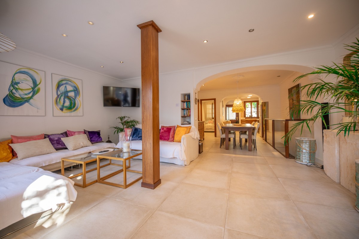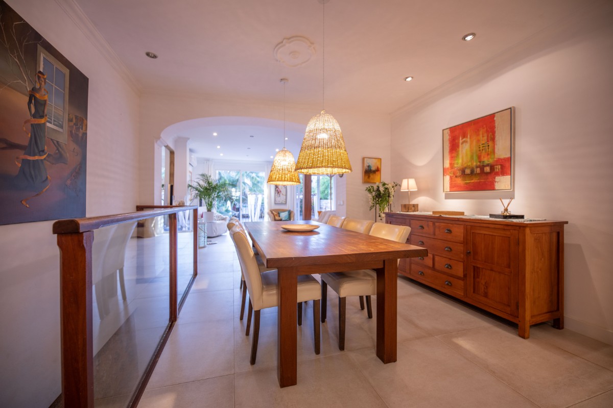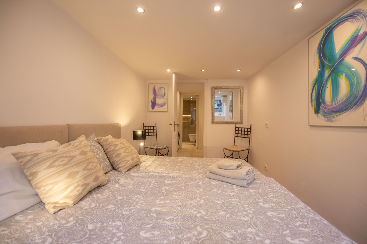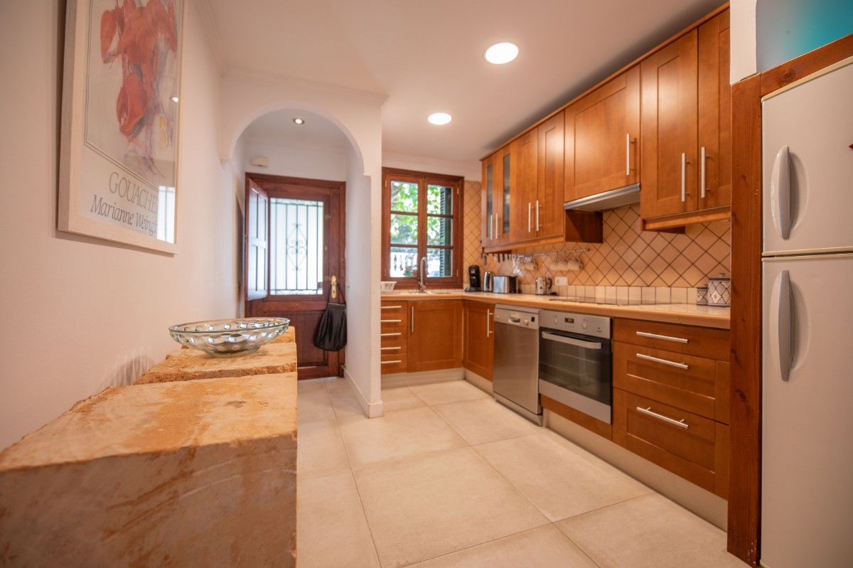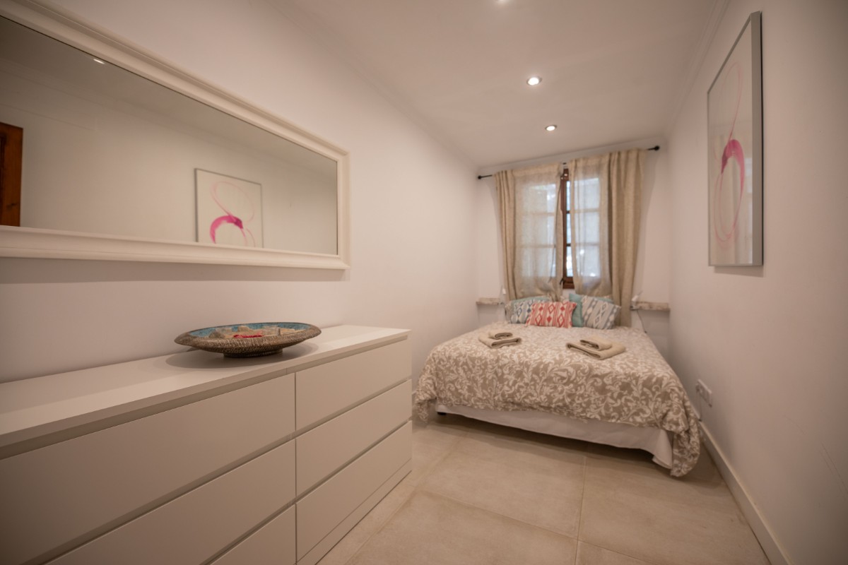 This spacious two-storey apartment occupies the ground floor of a townhouse shared by only two parties, located in a quiet residential area in the heart of Sóller. The private garden with a refreshing pool (6 x 2.5 m) and an additional outdoor kitchen offers the perfect setting to relax and enjoy the Mediterranean lifestyle. On the ground floor, the apartment features a bright living and dining area with an open-plan kitchen, a small bedroom, and a bathroom. A few steps lead down to the lovely garden. The lower level includes two double bedrooms and a large bathroom with a walk-in shower. Just a five-minute walk takes you to the main square of historic Sóller, famous for its vintage wooden tram that winds through orange groves and olive trees. The picturesque town of Sóller is increasingly popular, so the lively streets reflect the charm and rhythm of the season. The apartment is equipped with hot and cold air conditioning for year-round comfort.