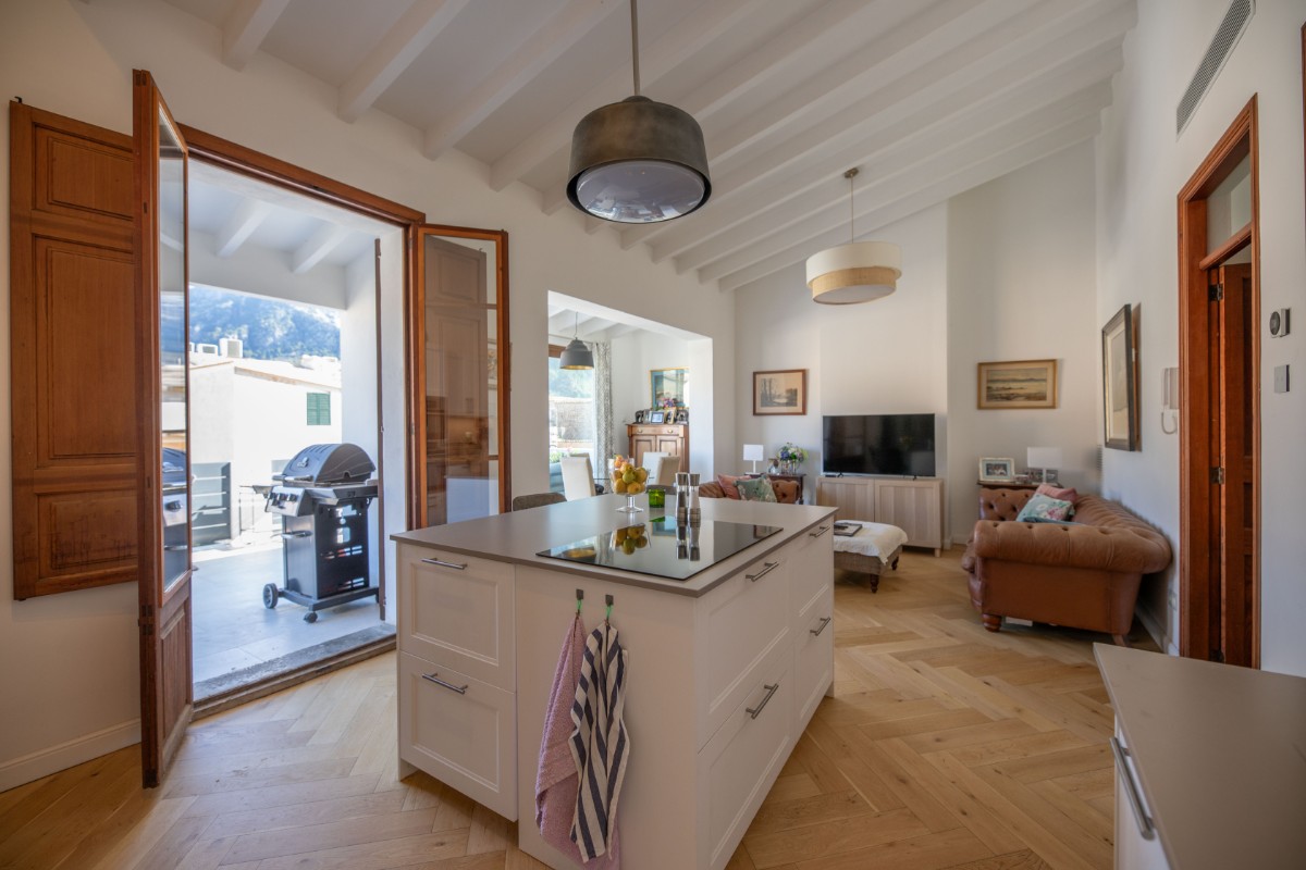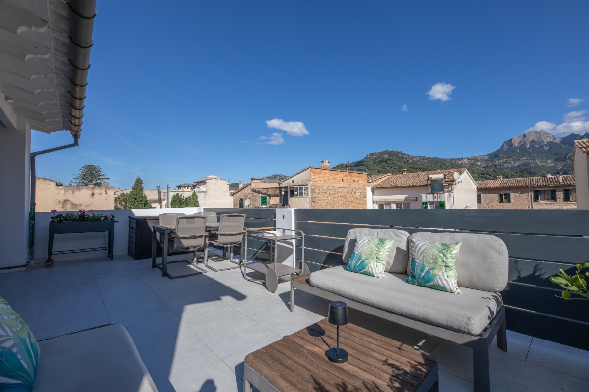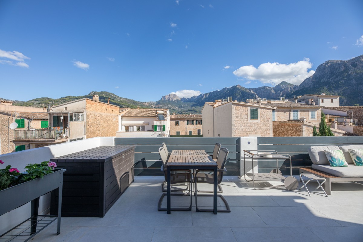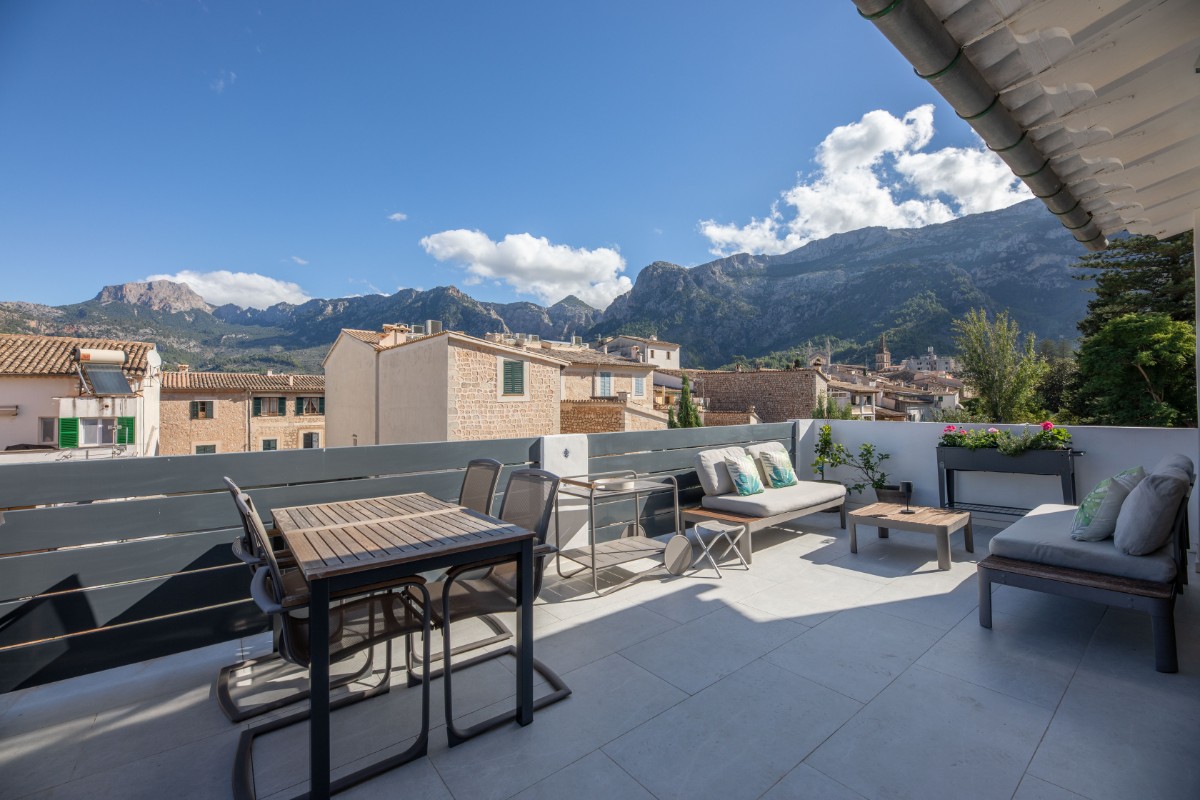 This absolutely charming and rare-to-find apartment in the heart of Sóller is a true gem. Located on the emblematic street of Gran Via in the old part of Sóller center, this completely renovated apartment offers a unique living experience. Situated on the second floor of a Mallorcan village house with only one more apartment, one can enjoy tranquil views of the Puig Major Mountain and the modernistic church of Sóller. Surrounded by historic townhouses and a tree-lined avenue, the setting is picturesque and serene. Just a few meters away, residents can easily walk to the bustling Great Square of Sóller, which is brimming with cafes, restaurants, and shopping opportunities. This 115 square metre apartment is comprised of 3 large bedrooms, one of which is currently used as an office/gym, with the master bedroom served by an en-suite bathroom. There is a second bathroom with a shower and also a guest toilet. The spacious living room seamlessly flows into the open-plan kitchen with a separate laundry room and attic storage. Large patio doors lead out to a beautiful 24 square metre terrace where you can indulge in breathtaking views of the surroundings. There is a split system for heating and cooling individually in each room, and pre-installation for solar panels. Dive into the essence of Sóller living in this exceptional residence.