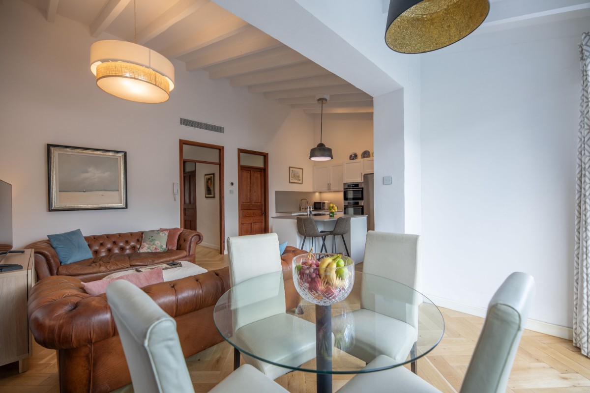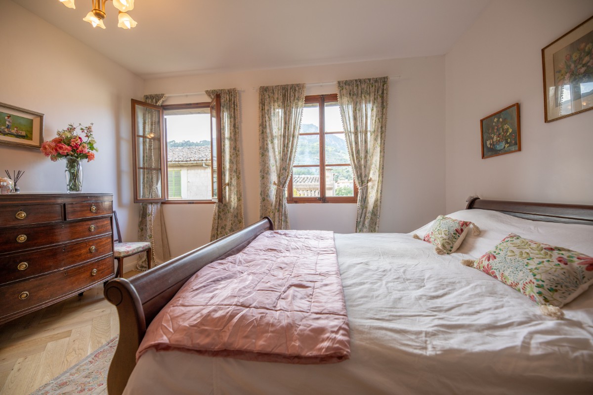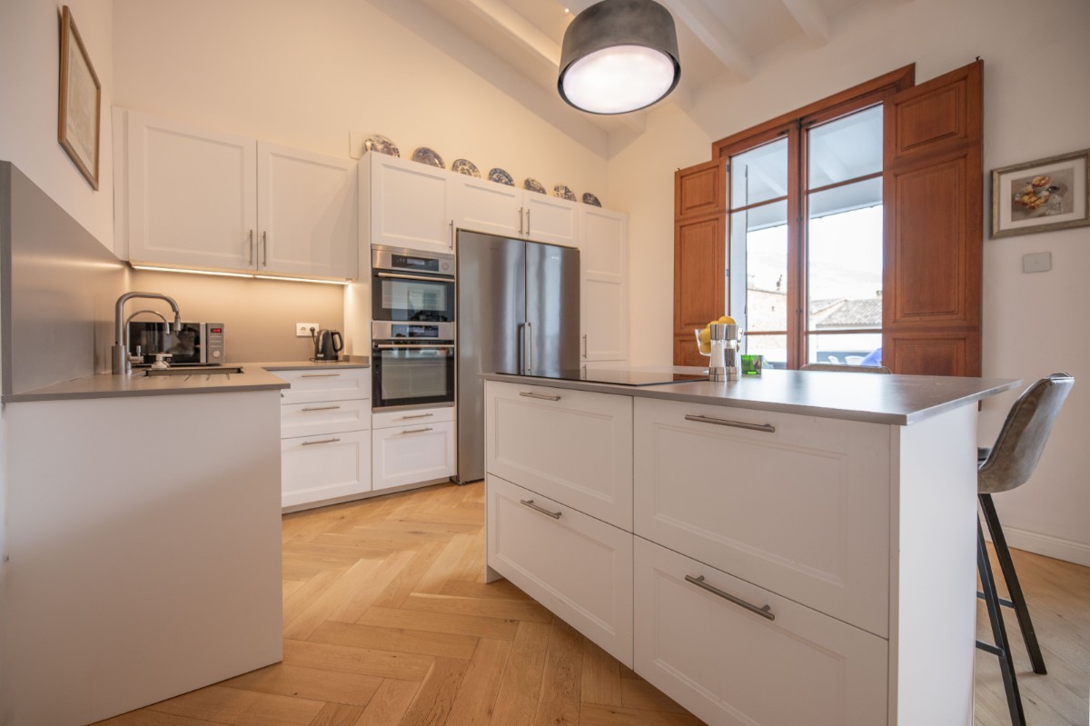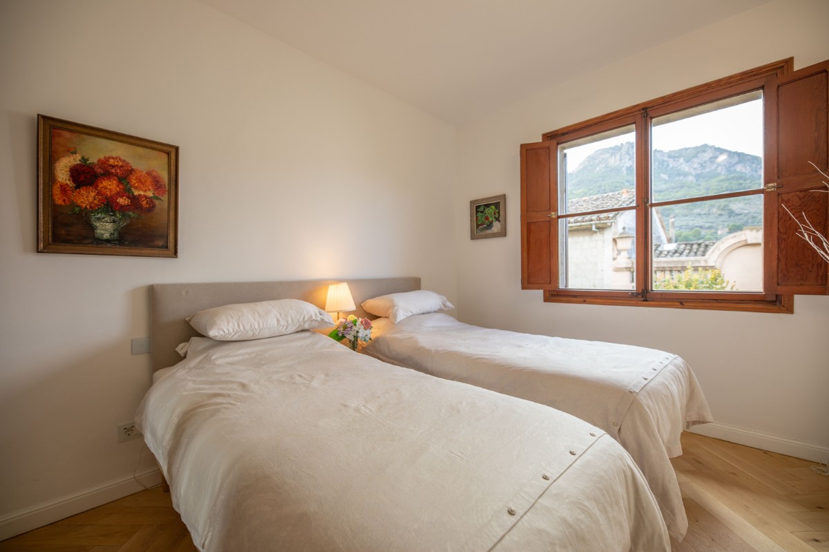 This absolutely charming and rare-to-find apartment in the heart of Sóller is a true gem. Located on the emblematic street of Gran Via in the old part of Sóller center, this completely renovated apartment offers a unique living experience. Situated on the second floor of a Mallorcan village house with only one more apartment, one can enjoy tranquil views of the Puig Major Mountain and the modernistic church of Sóller. Surrounded by historic townhouses and a tree-lined avenue, the setting is picturesque and serene. Just a few meters away, residents can easily walk to the bustling Great Square of Sóller, which is brimming with cafes, restaurants, and shopping opportunities. This 115 square metre apartment is comprised of 3 large bedrooms, one of which is currently used as an office/gym, with the master bedroom served by an en-suite bathroom. There is a second bathroom with a shower and also a guest toilet. The spacious living room seamlessly flows into the open-plan kitchen with a separate laundry room and attic storage. Large patio doors lead out to a beautiful 24 square metre terrace where you can indulge in breathtaking views of the surroundings. There is a split system for heating and cooling individually in each room, and pre-installation for solar panels. Dive into the essence of Sóller living in this exceptional residence.
